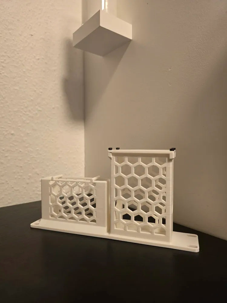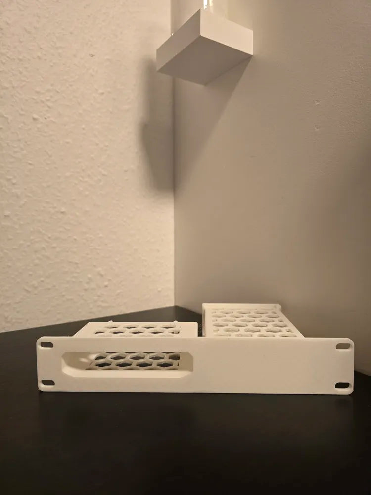 - Designet til at montere en Unifi UCG Fiber PSU og en Unifi Flex Mini switch i et 10-tommer rack.
