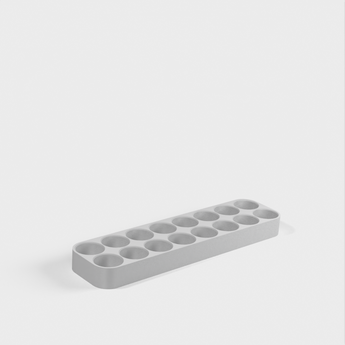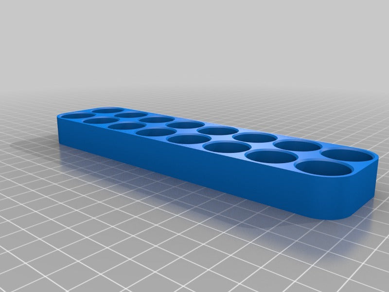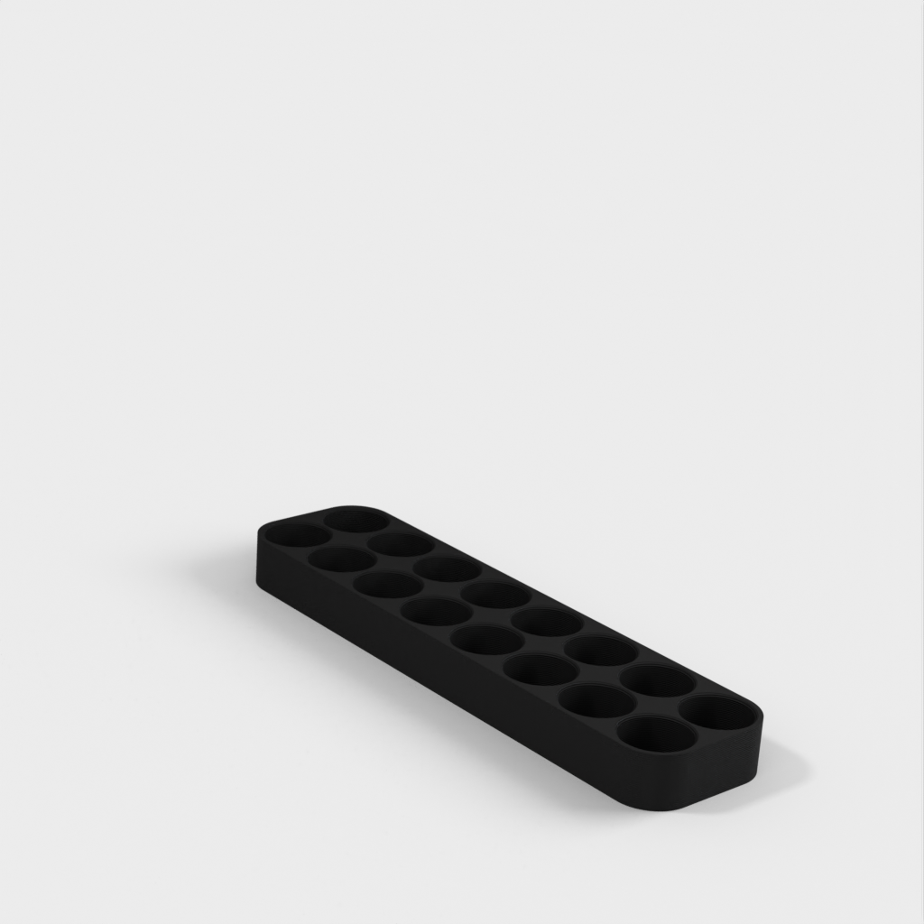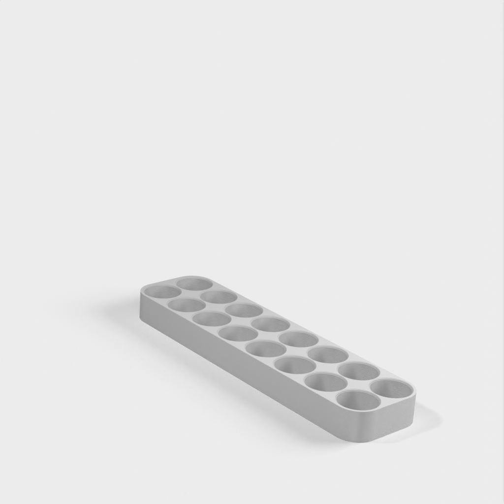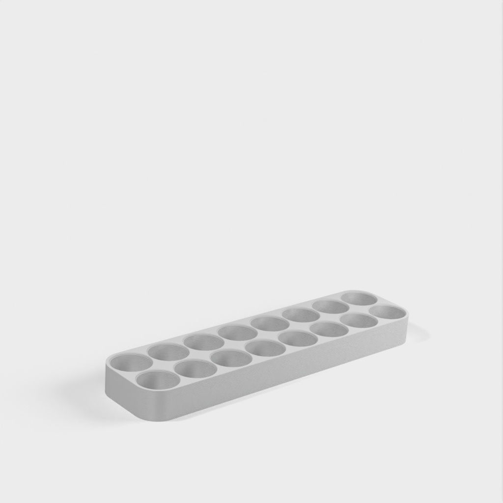 Detta är en enkel 18650 batterihållare för hylla eller bordsförvaring. Designen är justerbar med OpenSCAD, så mått, säkerhetsmarginal och antal batterier kan justeras efter behov. Den bifogade stl-filen är avsedd för 16 batterier.
