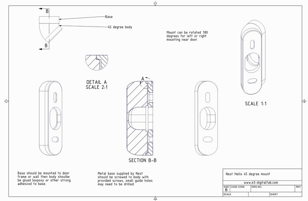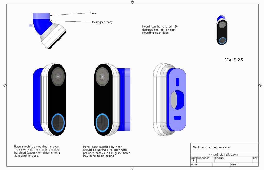 Det här monteringsfästet är designat speciellt för Google Nest Hello-dörrklocka och ser till att din dörrklocka är i en perfekt 45 graders vinkel. Setet består av två delar: en platt bas som enkelt kan monteras på en vägg eller dörrkarm med skruvar, och en 45-graders adapter som är i linje med basen och håller klockan i optimalt läge.
