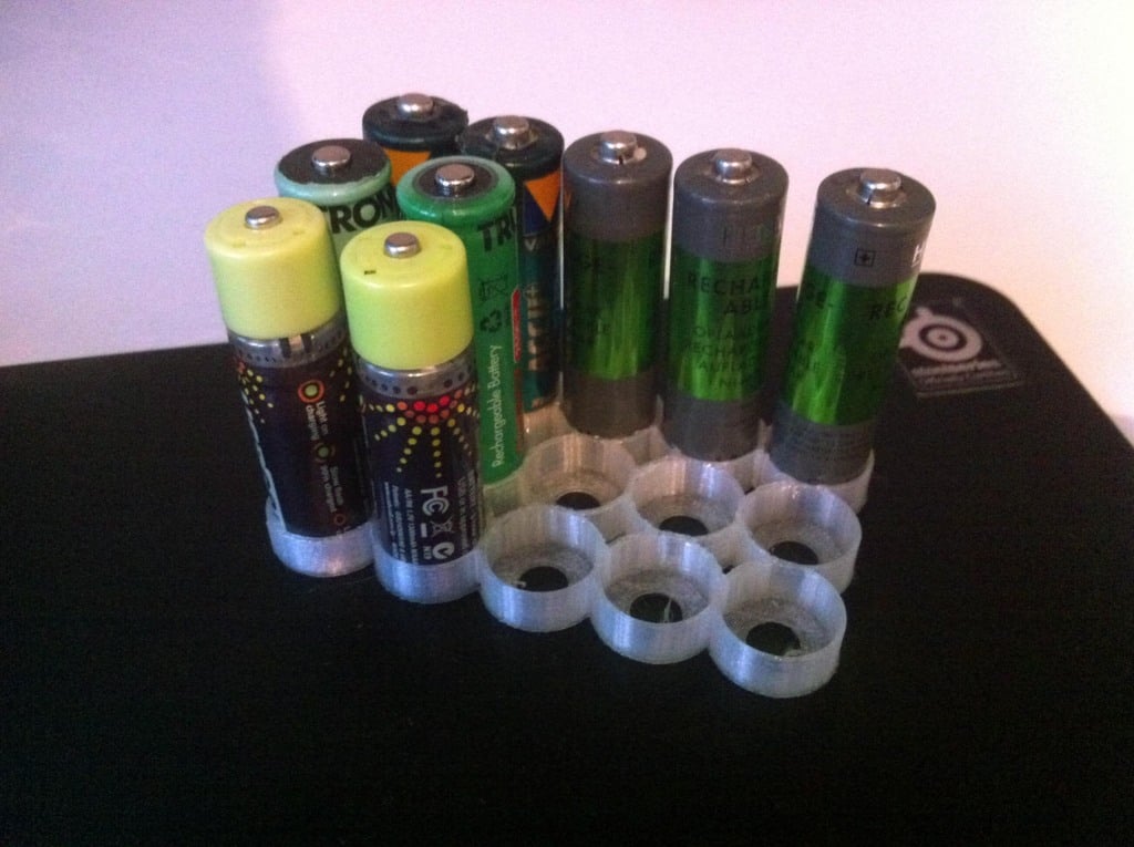 Detta är en enkel hållare för dina AA-batterier. Den kan justeras mindre till 0,725 för att passa AAA-batterier. Hållaren hjälper till att organisera och förvara dina batterier på ett effektivt sätt så att de alltid är redo att användas.