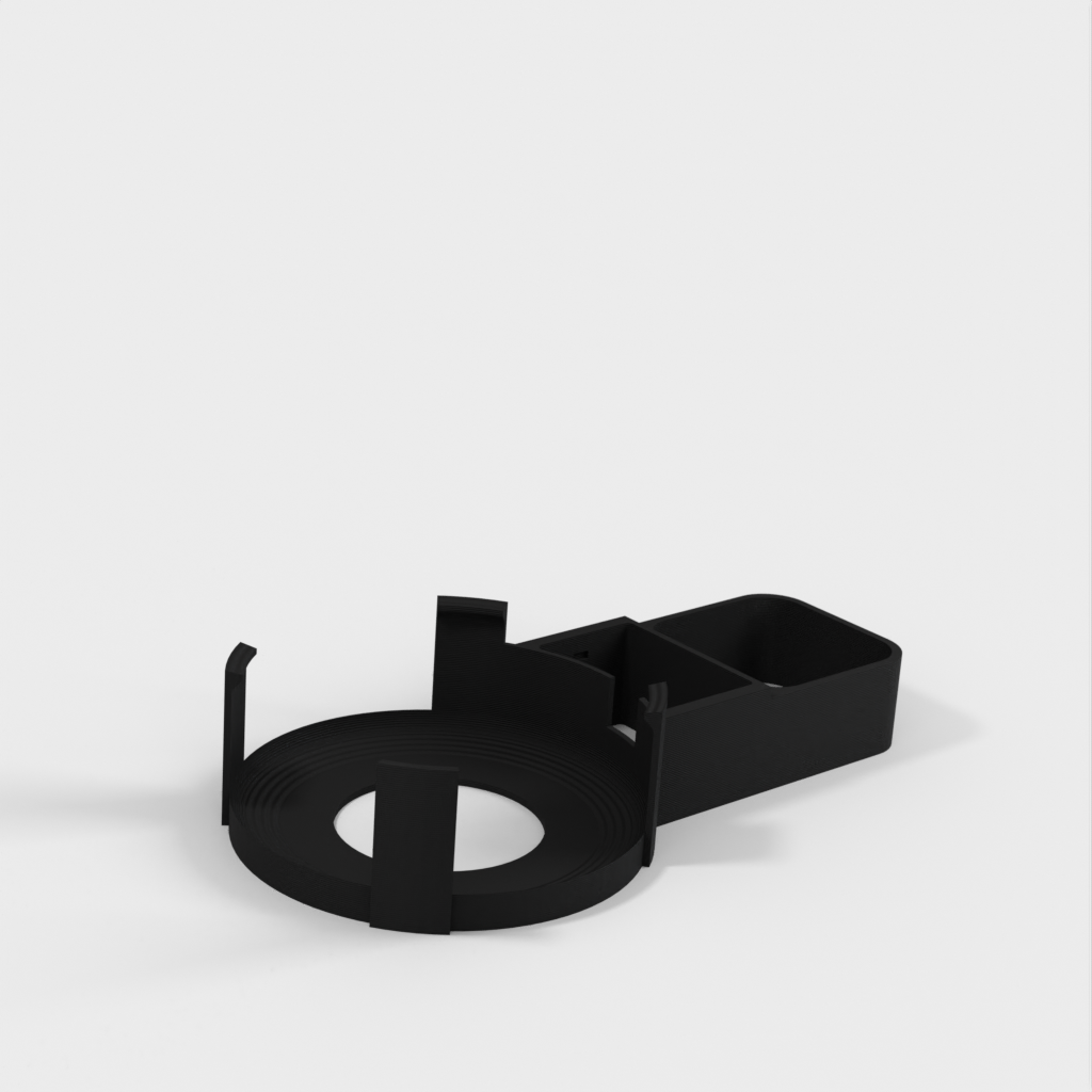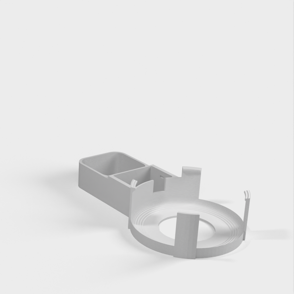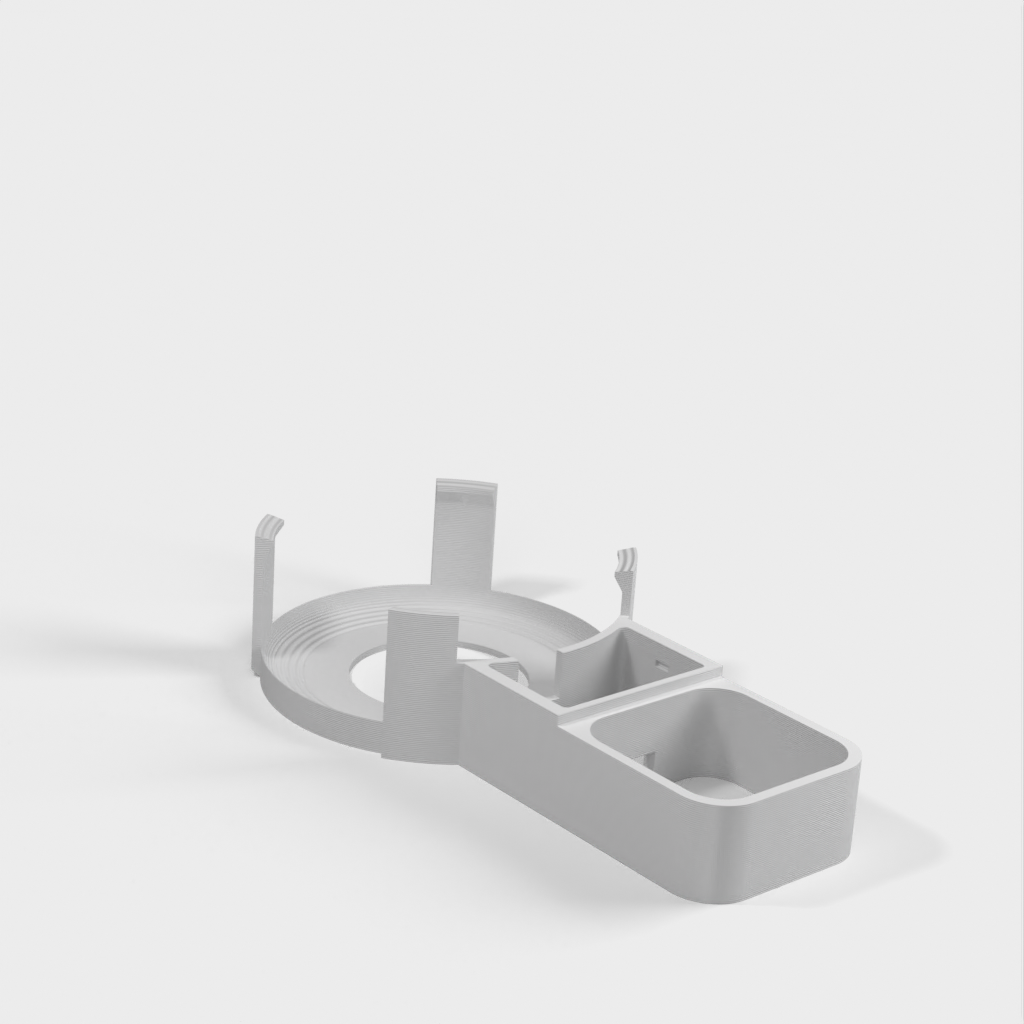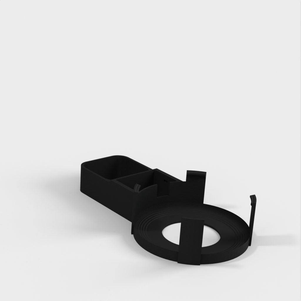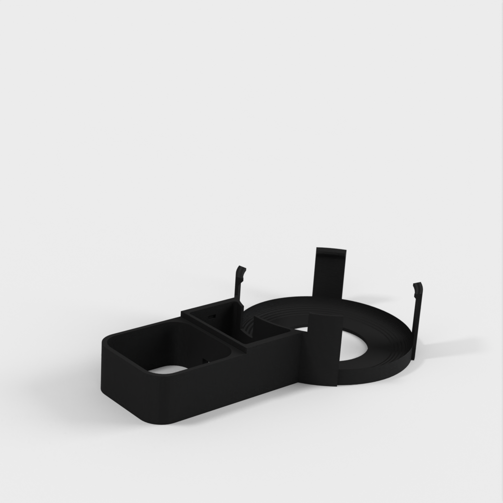 Beskrivning av Amazon Echo Dot (3:e generationens) väggkontaktfäste. Detta fäste är designat för att fästa din Echo Dot direkt i vägguttaget, vilket hjälper till att dölja sladden och spara utrymme. Monteringen är utformad för att inte blockera högtalarna på din Echo Dot, vilket säkerställer en optimal ljudupplevelse. Förutom Echo Dot-hållaren innehåller satsen en bas som glider på undersidan av strömförsörjningen och gör det möjligt att linda sladden runt en central "kärna", en topp som glider ner över strömförsörjningens ovansida och snäpper fast basen och ett skydd för att täcka området där kabeln går in i Echo Dot.