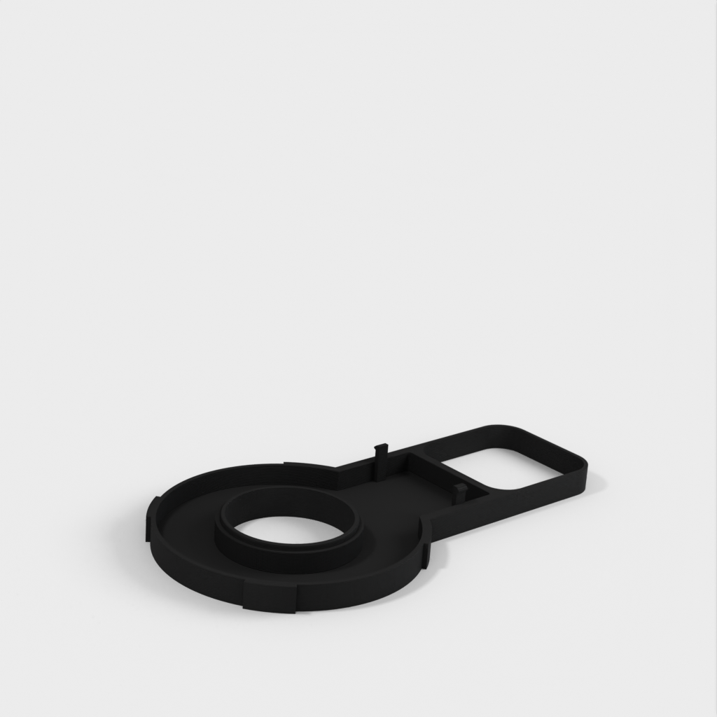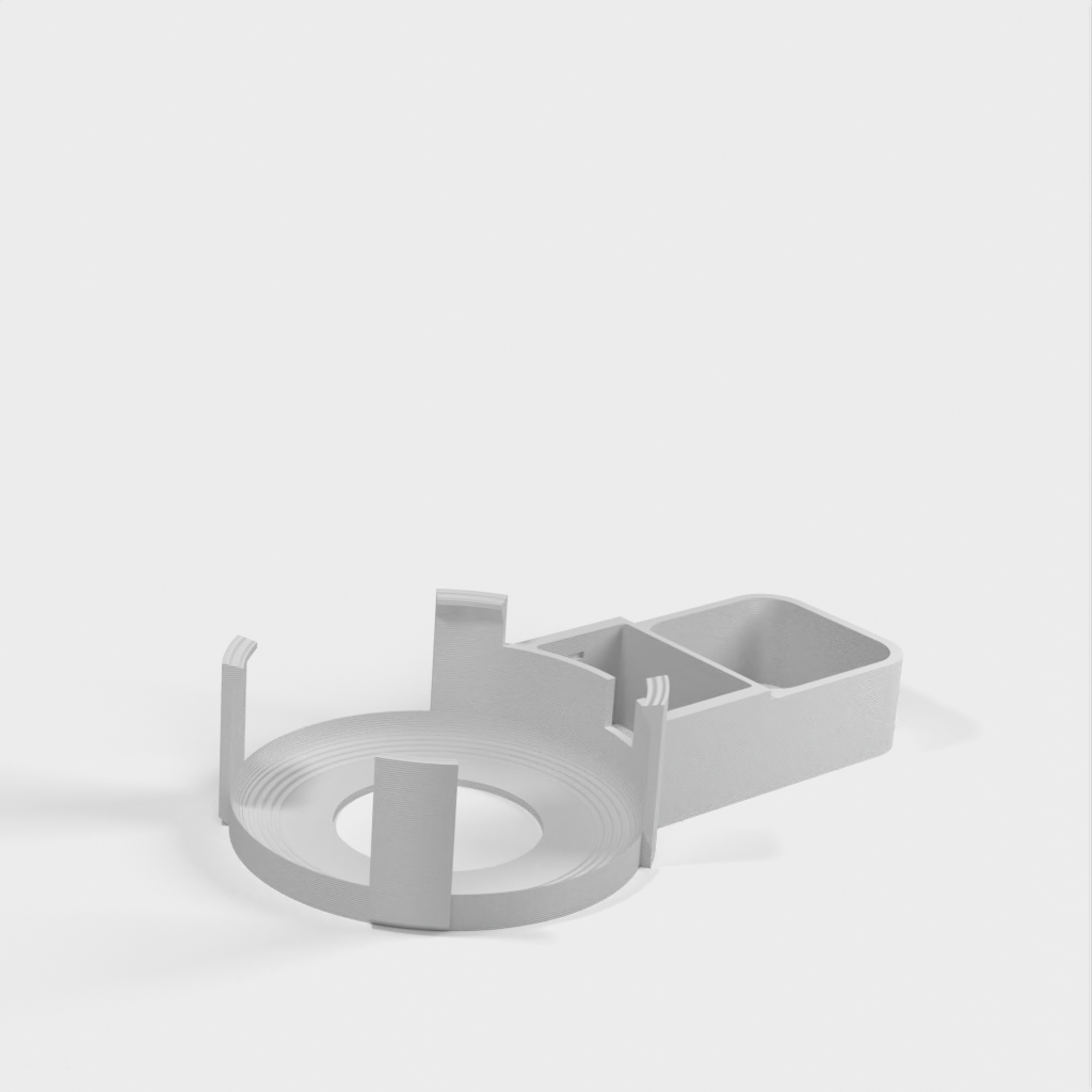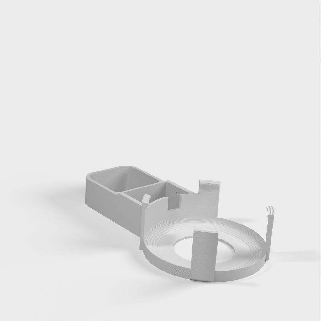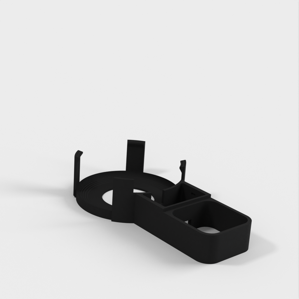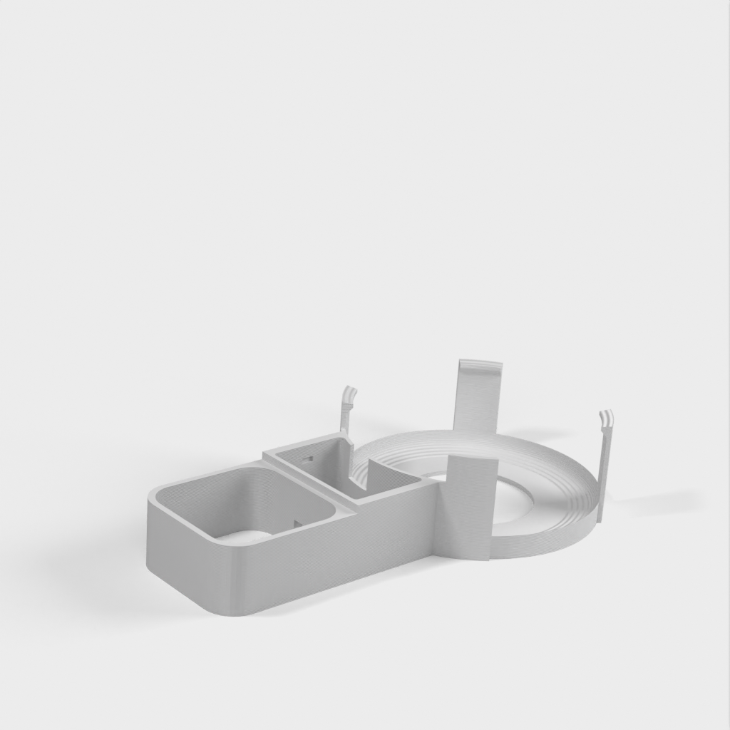 Beskrivning av Amazon Echo Dot (3:e generationens) väggkontaktfäste. Detta fäste är designat för att fästa din Echo Dot direkt i vägguttaget, vilket hjälper till att dölja sladden och spara utrymme. Monteringen är utformad för att inte blockera högtalarna på din Echo Dot, vilket säkerställer en optimal ljudupplevelse. Förutom Echo Dot-hållaren innehåller satsen en bas som glider på undersidan av strömförsörjningen och gör det möjligt att linda sladden runt en central "kärna", en topp som glider ner över strömförsörjningens ovansida och snäpper fast basen och ett skydd för att täcka området där kabeln går in i Echo Dot.