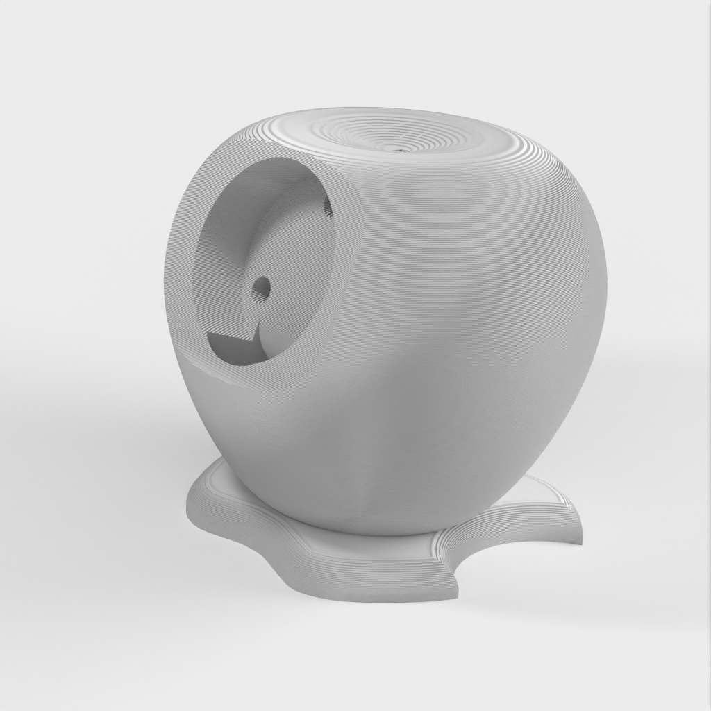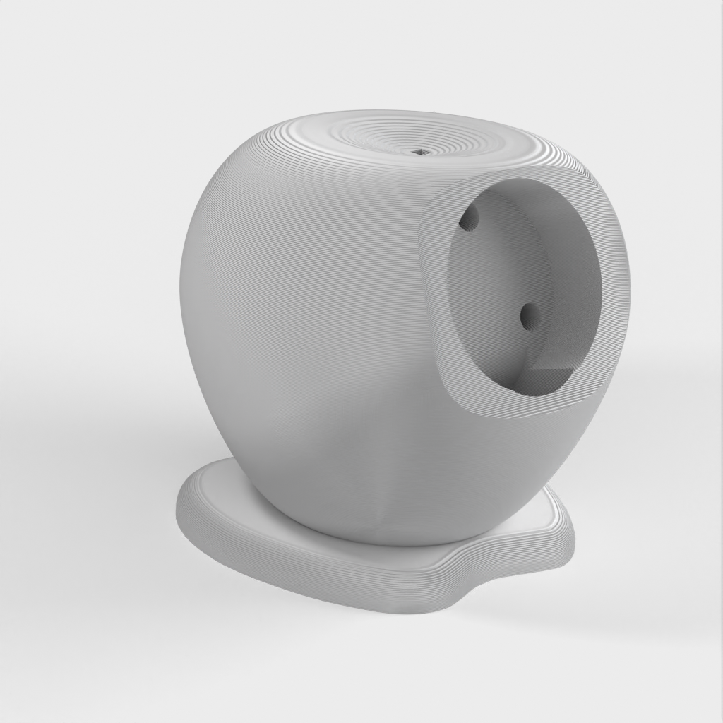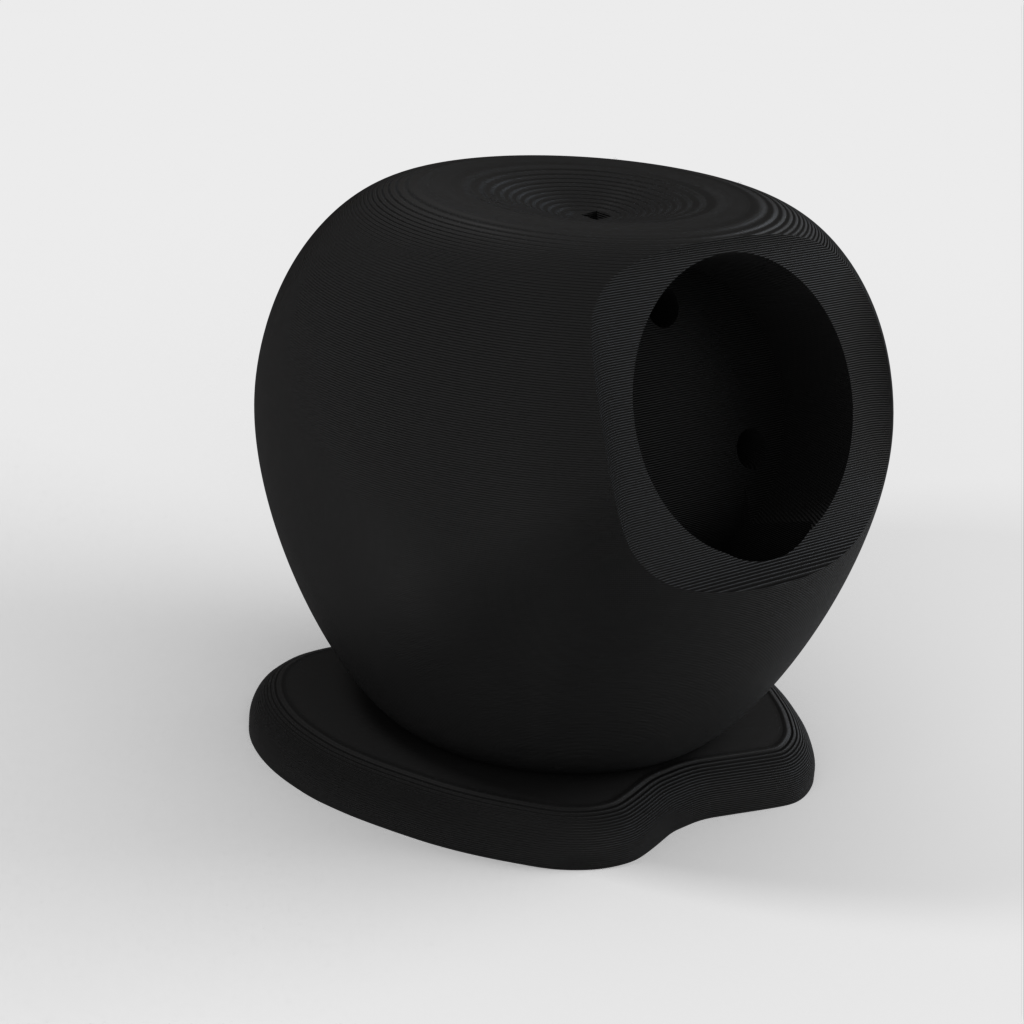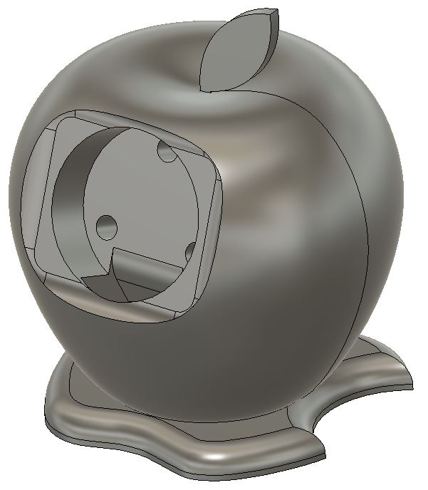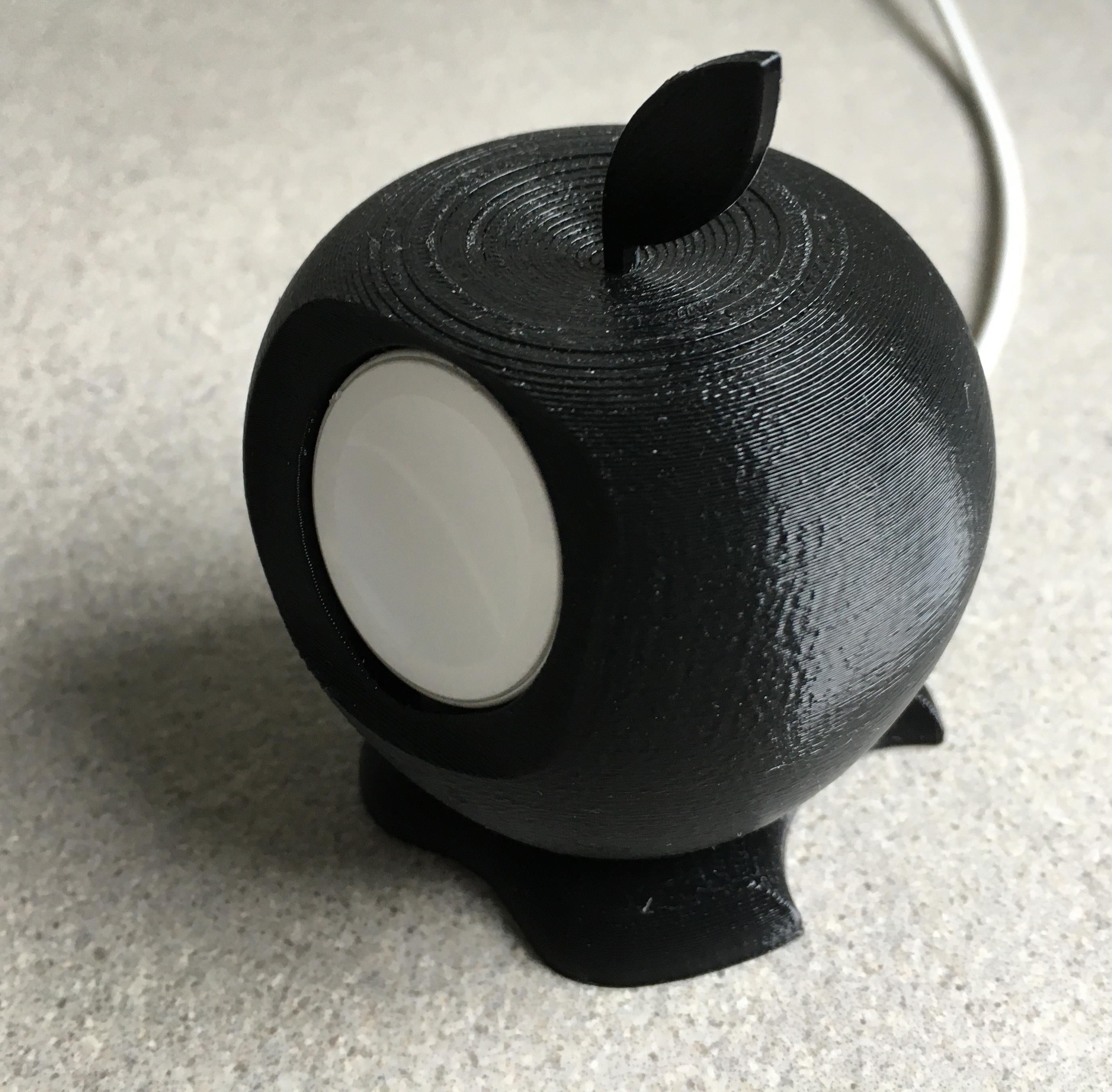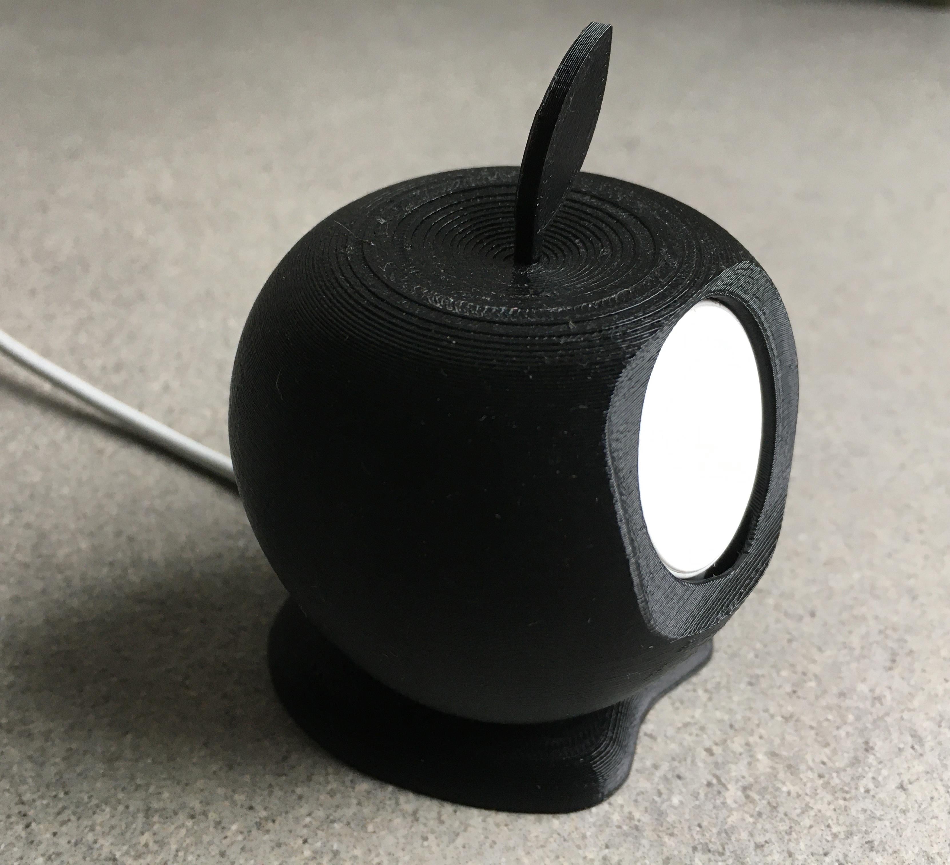 Laddningsställ för Apple Watch (40 mm) designat i form av Apple-logotypen. Kabeln förs genom hålet och laddaren klickar på plats. Modellen har hål på baksidan för att trycka ut laddaren vid behov.