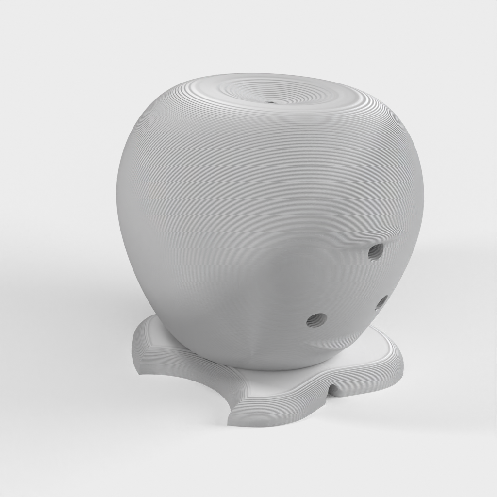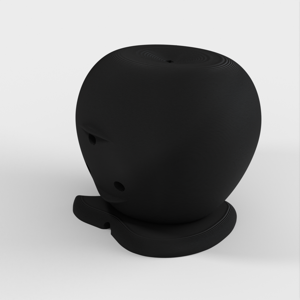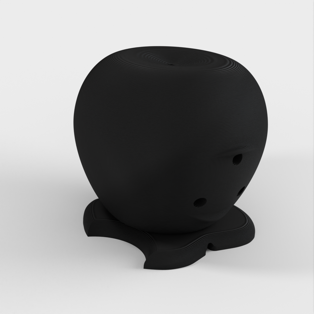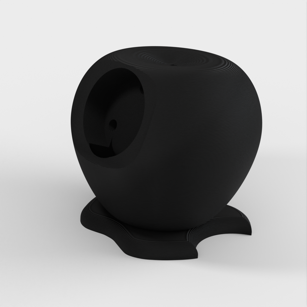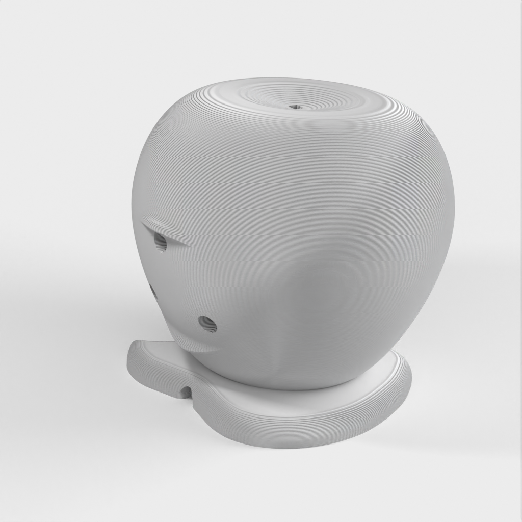 Laddningsställ för Apple Watch (40 mm) designat i form av Apple-logotypen. Kabeln förs genom hålet och laddaren klickar på plats. Modellen har hål på baksidan för att trycka ut laddaren vid behov.