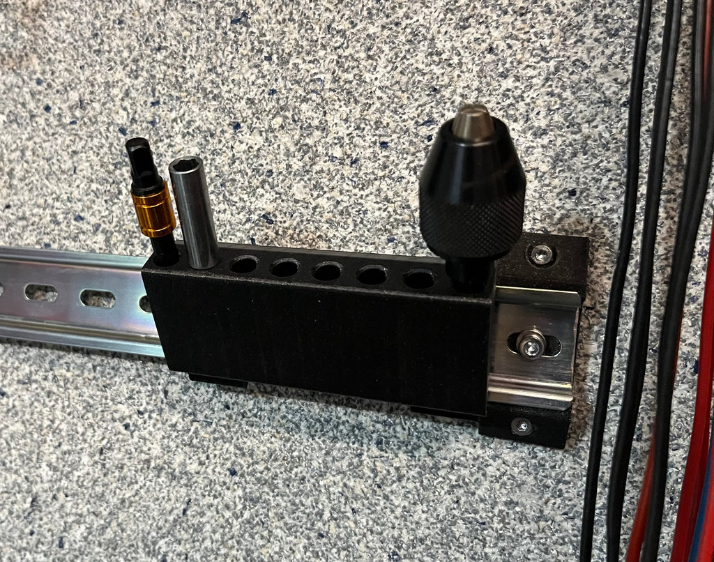 Denna praktiska bitshållare är utformad för att ge dig en organiserad och effektiv arbetsyta. Med plats för upp till 8 vanliga skruvmejselbits håller den dina mest använda bits säkert på plats och inom räckhåll. Den är speciellt utformad för enkel montering på en vanlig DIN-skena, vilket gör den till en idealisk lösning för alla som vill hålla koll på sina verktyg.