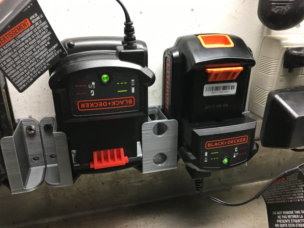 Enkla eller dubbla batterihållare håller Black & Decker (och eftermarknad) batterier när du använder det medföljande laddarfästet. Batterier kan fästas upp och ner.