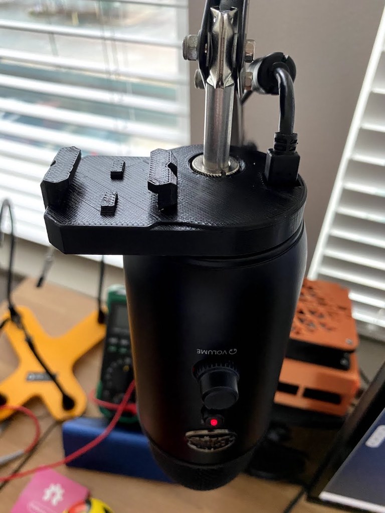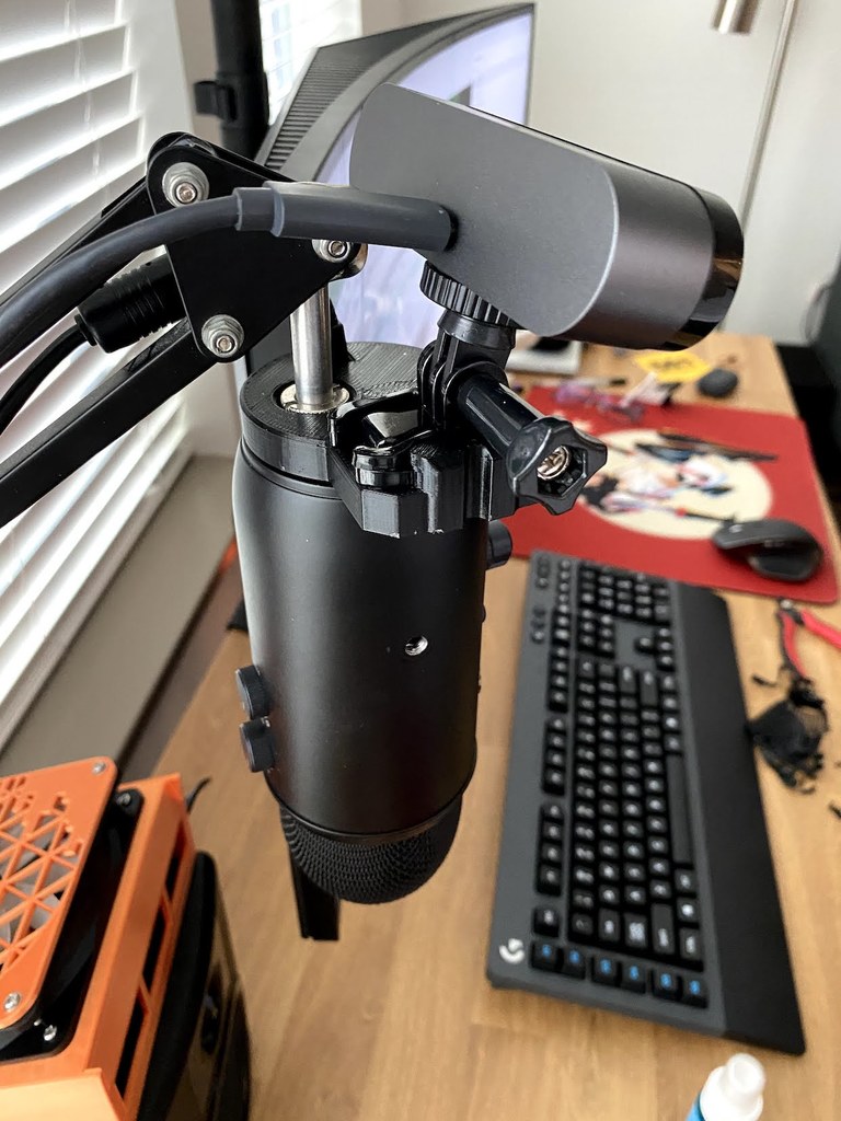 Detta är ett fäste för en Blue Yeti-mikrofon som låter dig montera en GoPro eller webbkamera ovanpå (eller faktiskt under) mikrofonen. En idealisk lösning för dem med en vertikal, staplad skärmuppställning eftersom den håller webbkameran upphöjd och vänd mot användaren från sidan.