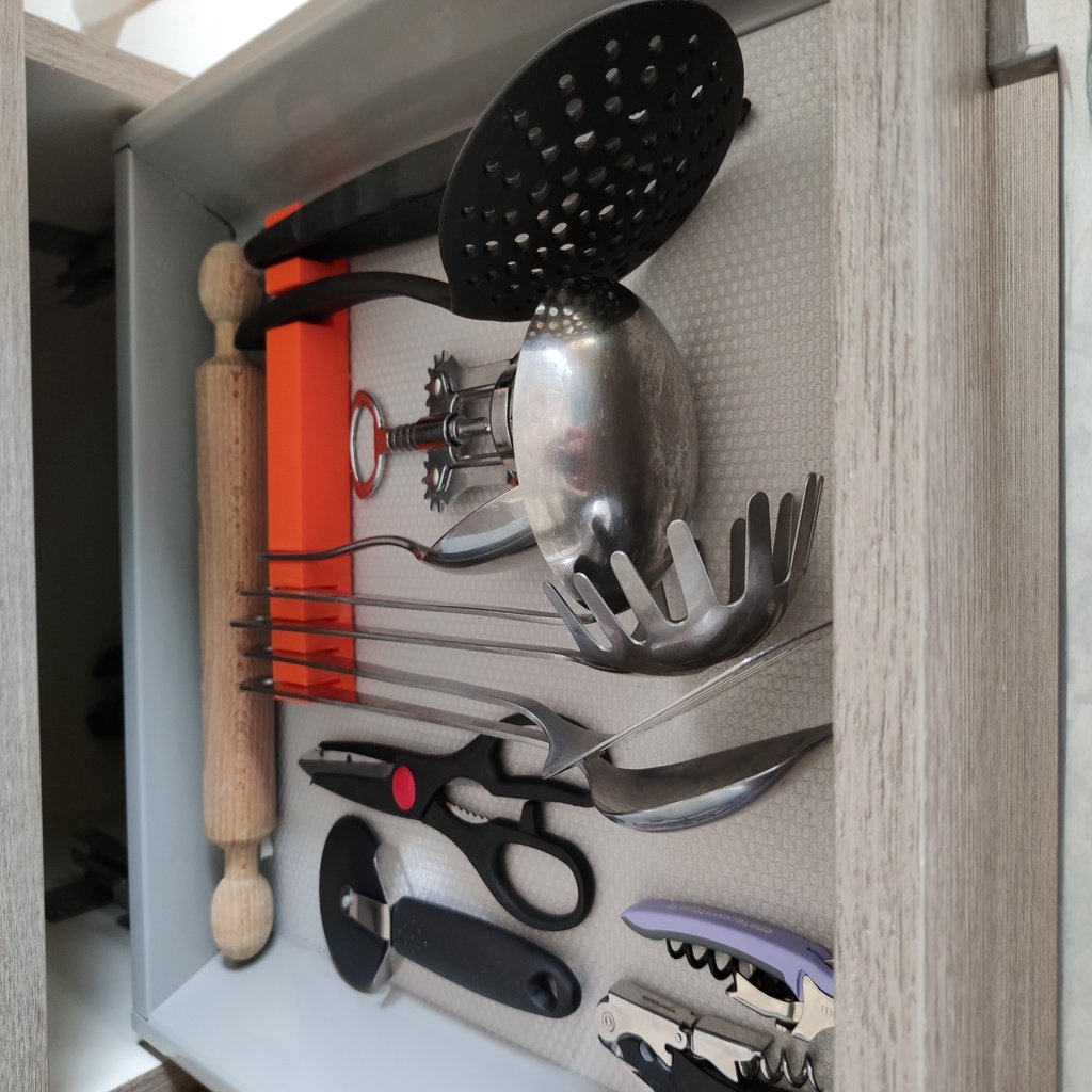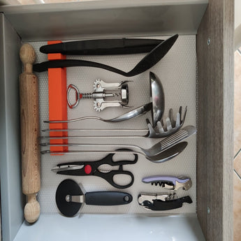 Denna lådinsats är utformad för att skapa ordning och optimera förvaringen i dina kökslådor. Med sina sju separata fack kan du enkelt sortera och förvara ett brett utbud av köksredskap, såsom bestick och små prylar. Detta ger en tydlig översikt och säkerställer att du snabbt hittar det du letar efter utan att behöva rota. För dig som gör en grundlig "konkurrentsökning" efter effektiva lösningar för köksorganisation, erbjuder denna insats ett praktiskt sätt att förbättra funktionaliteten. Även om den är idealisk för köksredskap, bidrar den till den allmänna ordningen i lådan, precis som en "kryddorganisatör" håller reda på kryddor och därmed bidrar till en snyggare och mer effektiv köksmiljö.