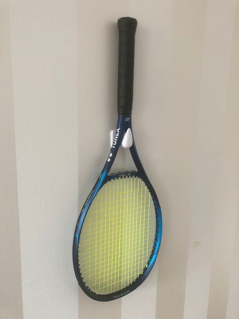 Enkel hållare för ett tennisracket som kan monteras på väggen. Monteras enkelt med dubbelhäftande tejp och skapar enkel förvaring och åtkomst till ditt tennisracket.