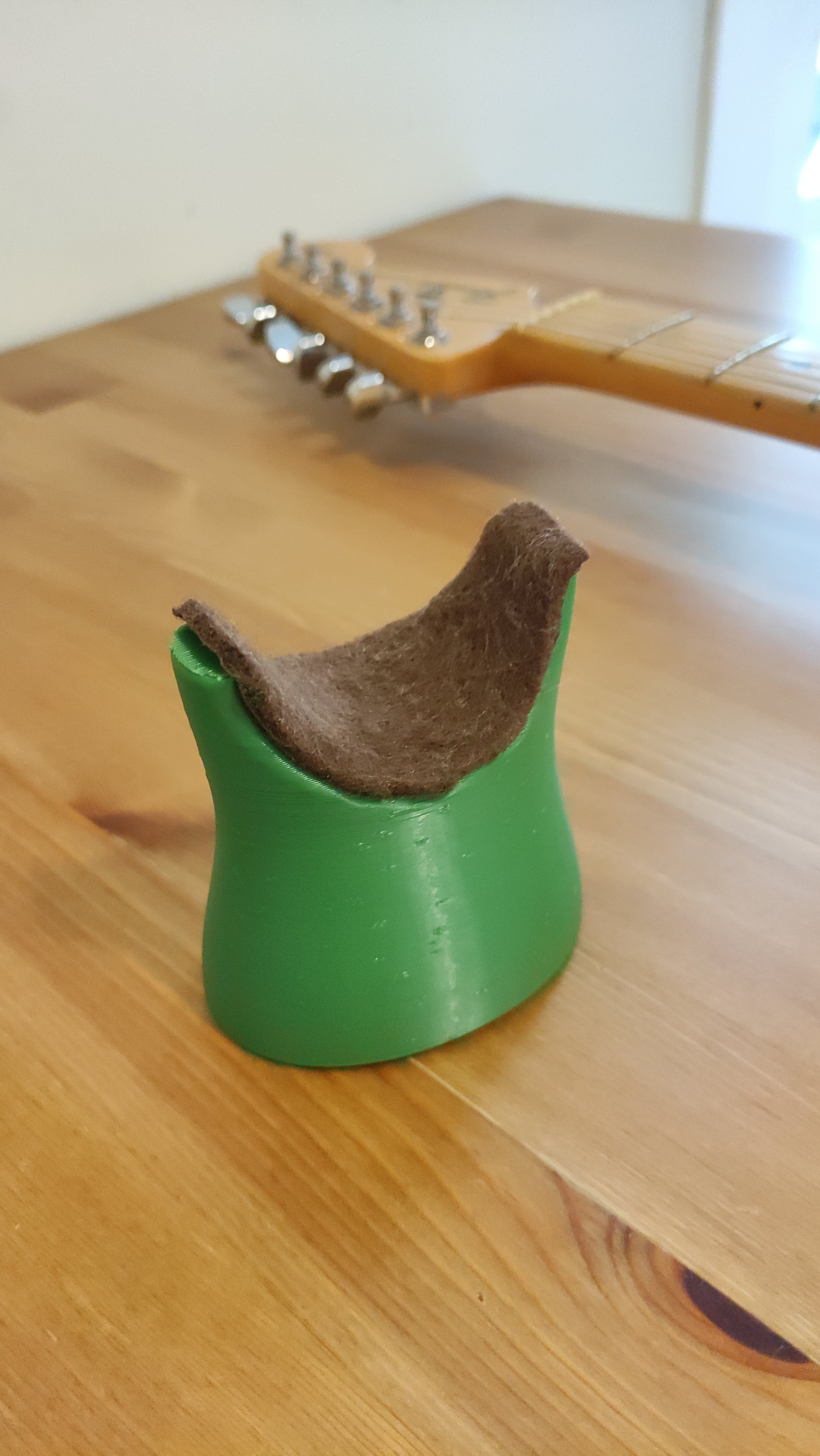 Halsstödet är dock mångsidigt och kan även användas högre upp på gitarrens hals, beroende på uppgiften. För att skydda gitarrens lack och träslöjd rekommenderas det starkt att vaddera kontaktytan med ett mjukt material som självhäftande filt. Den lätt böjda basen är utformad för att ge god balans och följa gitarrens naturliga vinkel under arbete, vilket bidrar till ökad stabilitet.