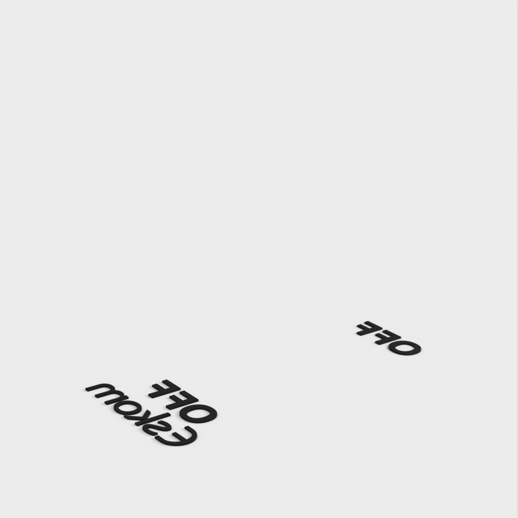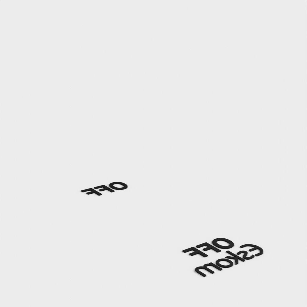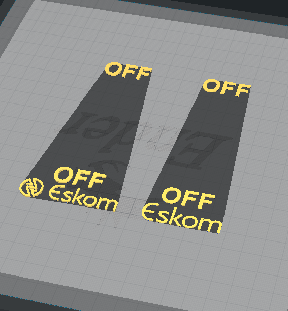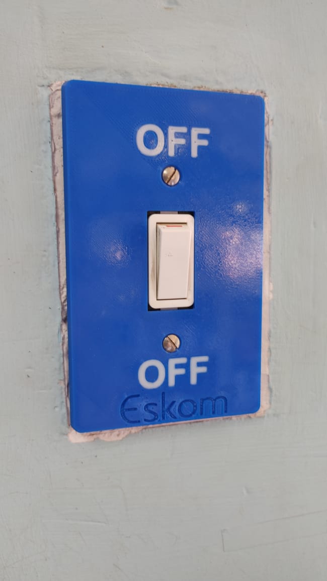 Detta är en täckmantel för lätt kontakt med en humoristisk skildring av "lastshedding"-situationen som alla sydafrikaner är bekanta med och fruktar. Det finns fyra separata filer där texten separeras från plattan så att du kan sätta ihop modellerna i din slicer och göra ett tvåfärgstryck.