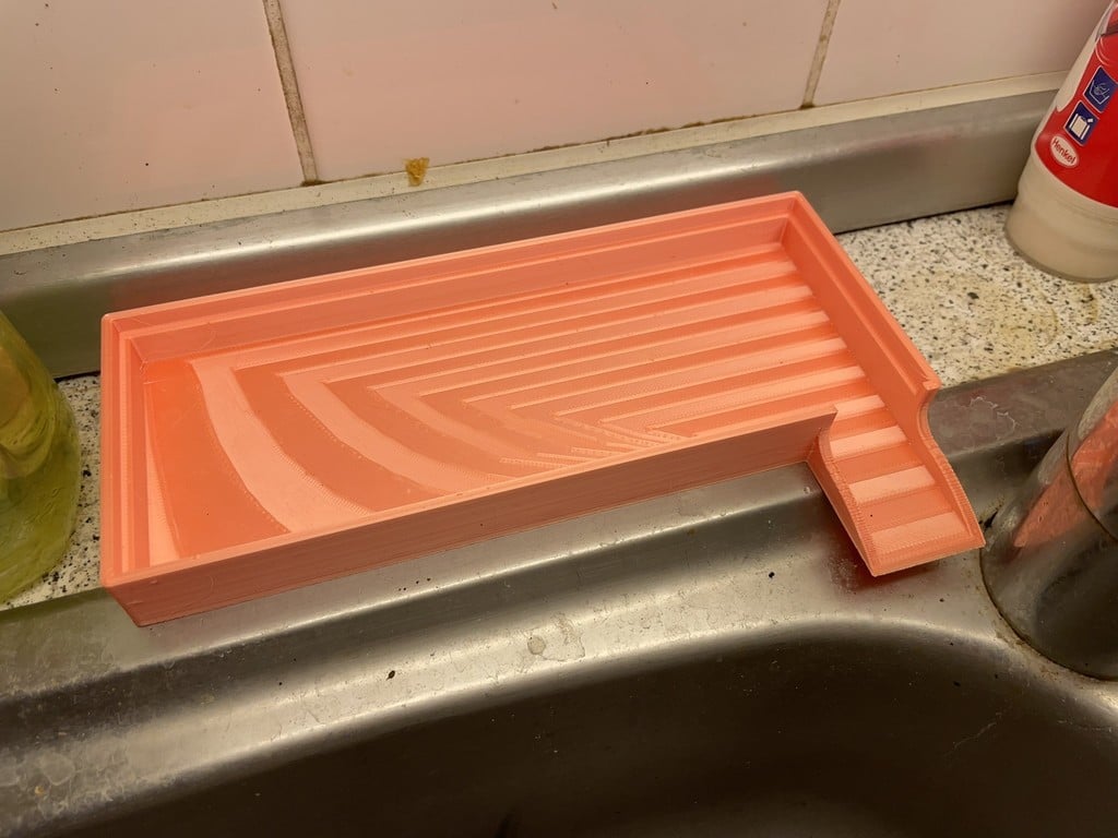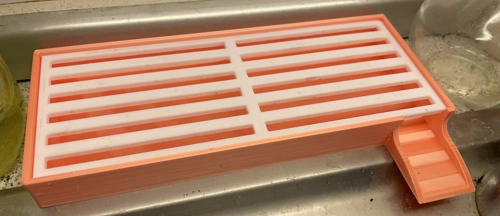 Måtten på förvaringslådan är väl genomtänkta för att passa i de flesta vanliga köksvaskar. Basen mäter 8 cm x 20 cm x 2 cm och inkluderar ett avlopp som är 3,5 cm långt och 3 cm brett. Själva hyllan mäter 7,4 cm x 19,4 cm, och flaskhållaren har en höjd på 13,8 cm, vilket ger gott om plats för ännu högre flaskor.