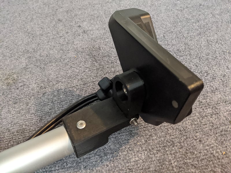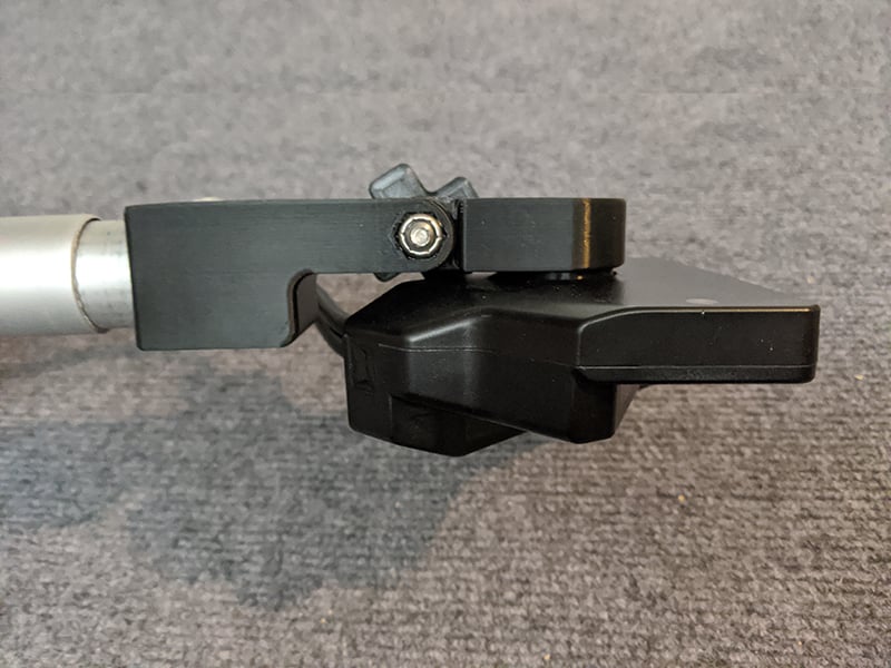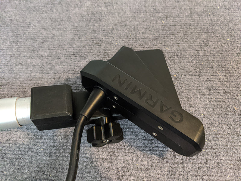 Garmin Livescope Sonar Transducer Stångfäste med vy, vy nedåt och perspektivvy. Denna givare är utformad för att enkelt montera din Garmin Livescope ekolodsgivare ovanpå en 28 mm stång (stav ingår ej).