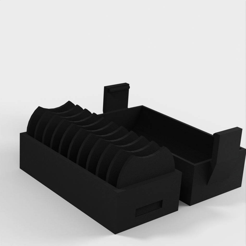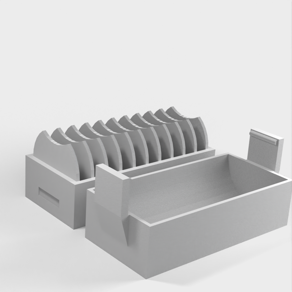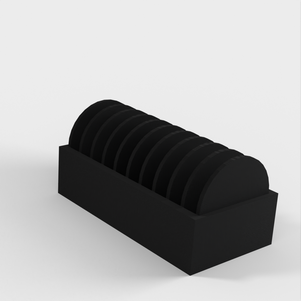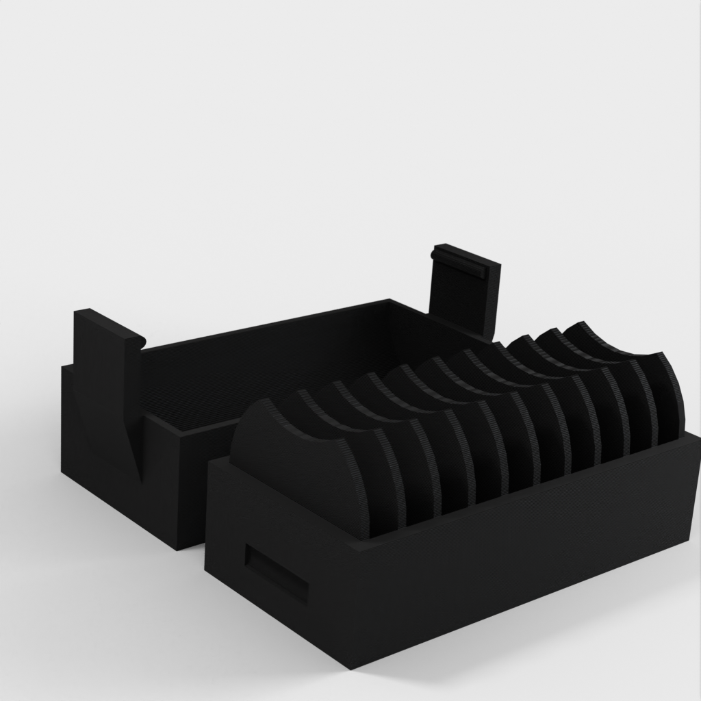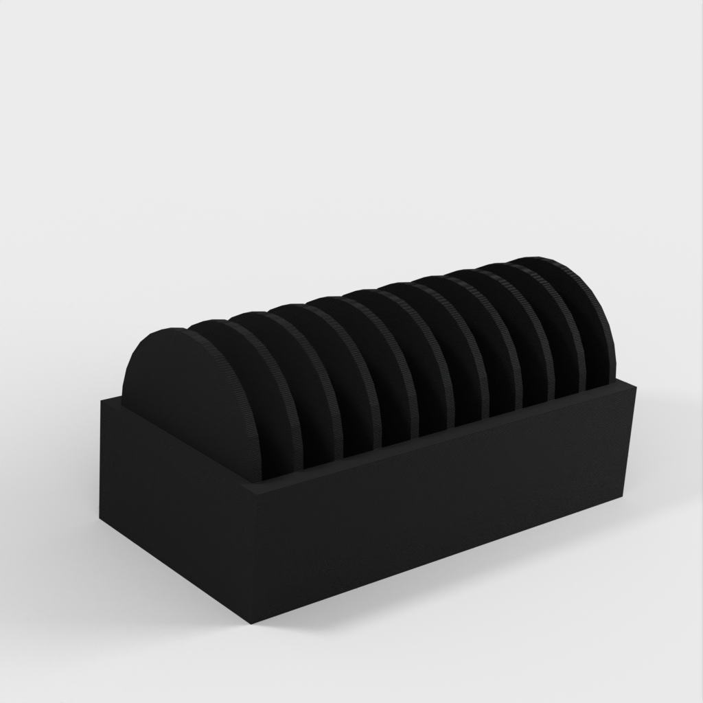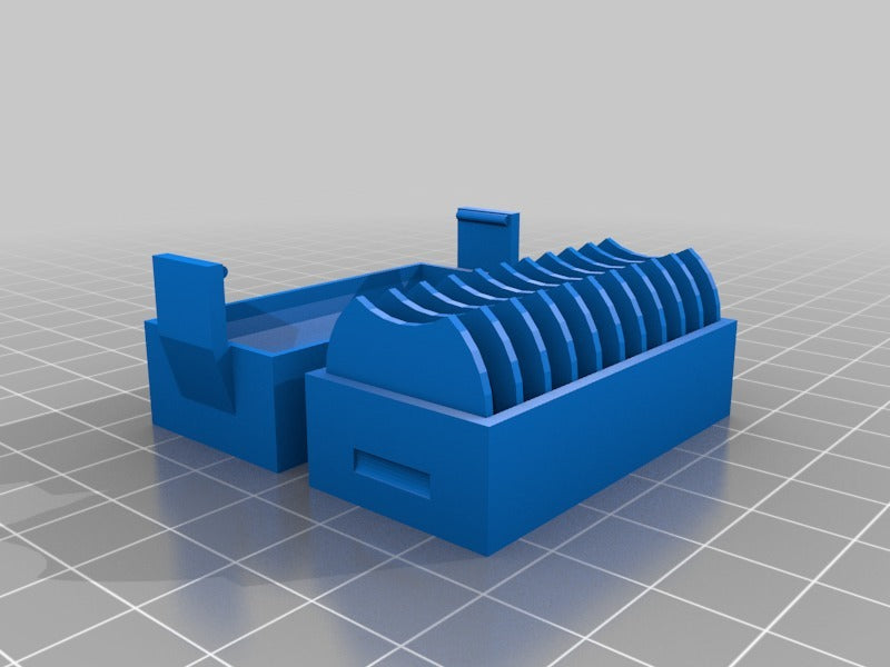 En liten hållare för 10 st. CR2032 myntbatterier. En ny version har lagts till med ett lock som gör det enklare att sätta i och ta ur batterierna. Locket har en klämma för att hålla batterierna på plats om det ramlar omkull.