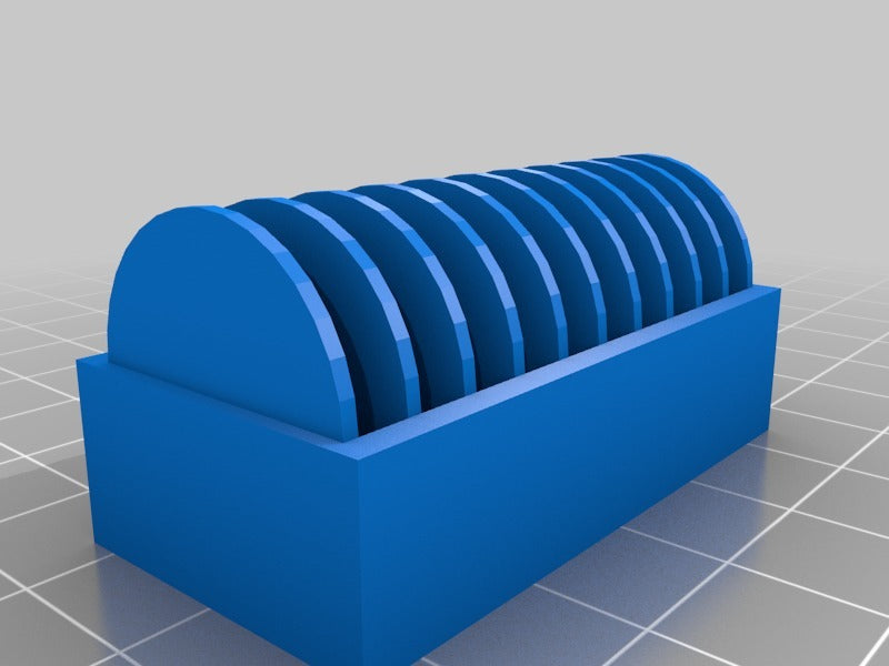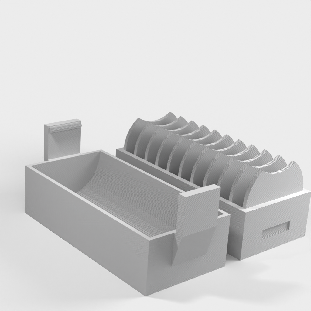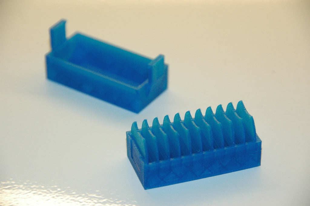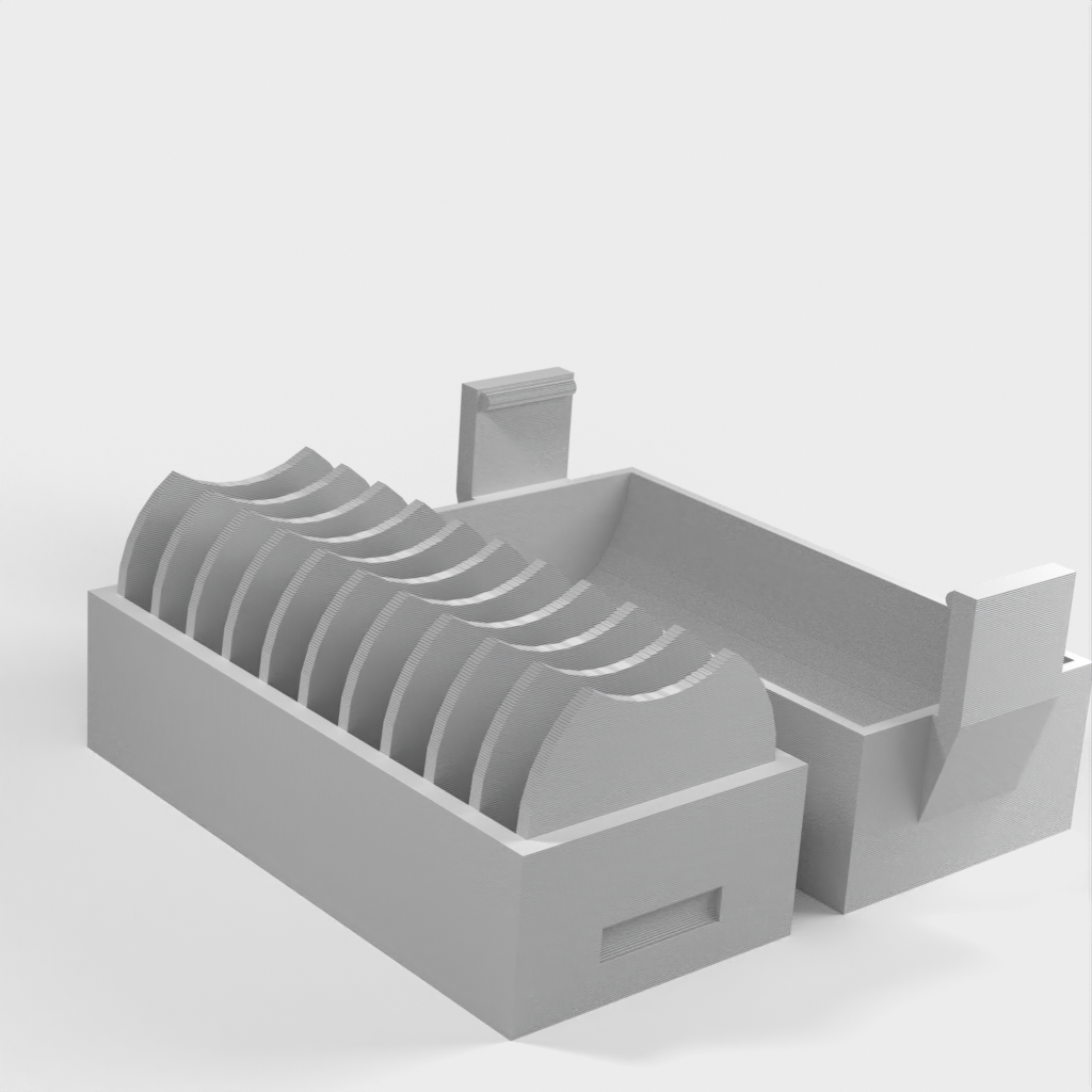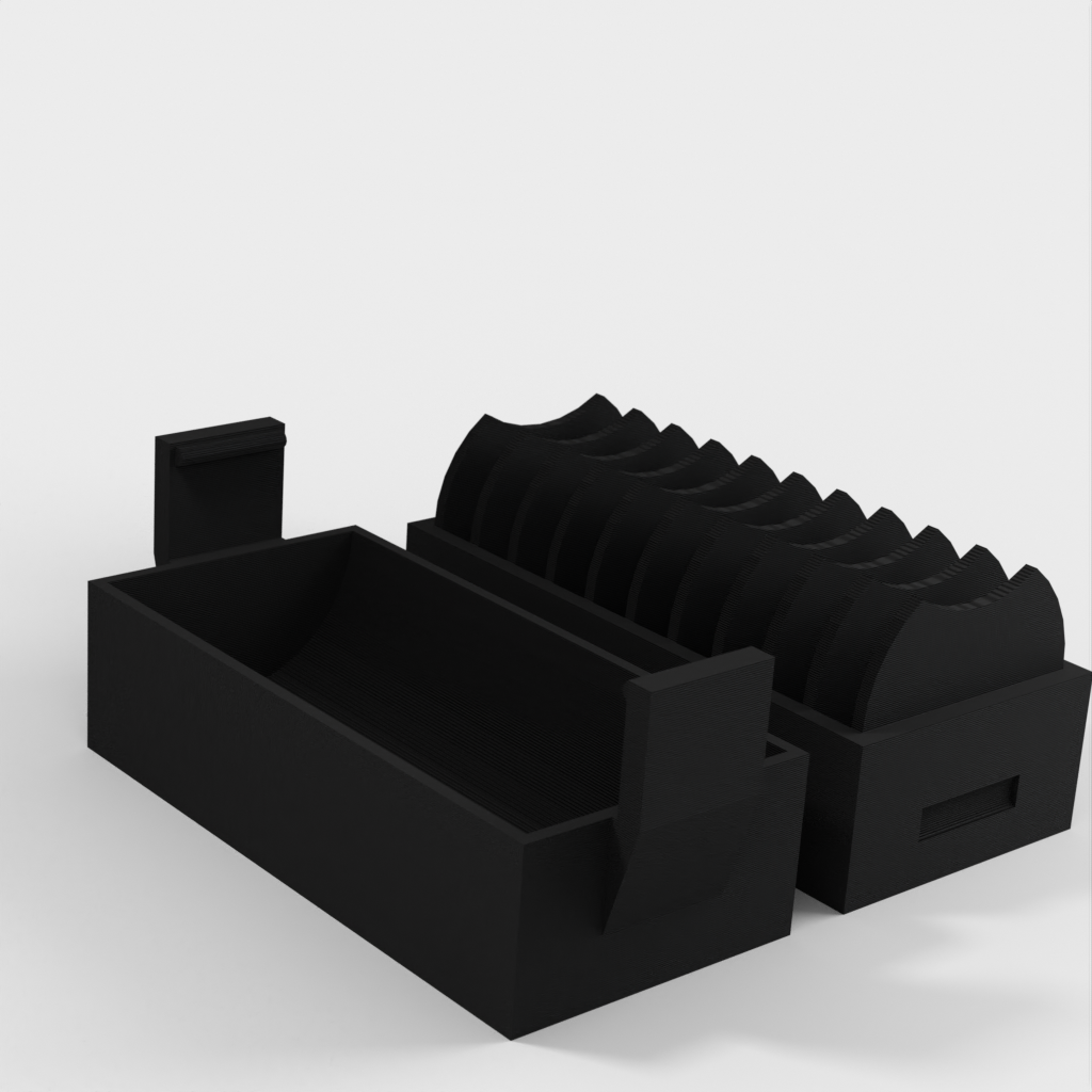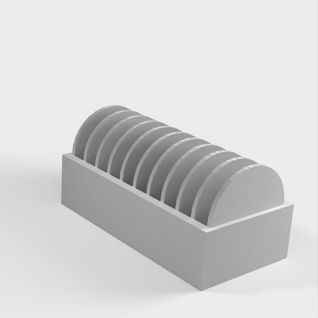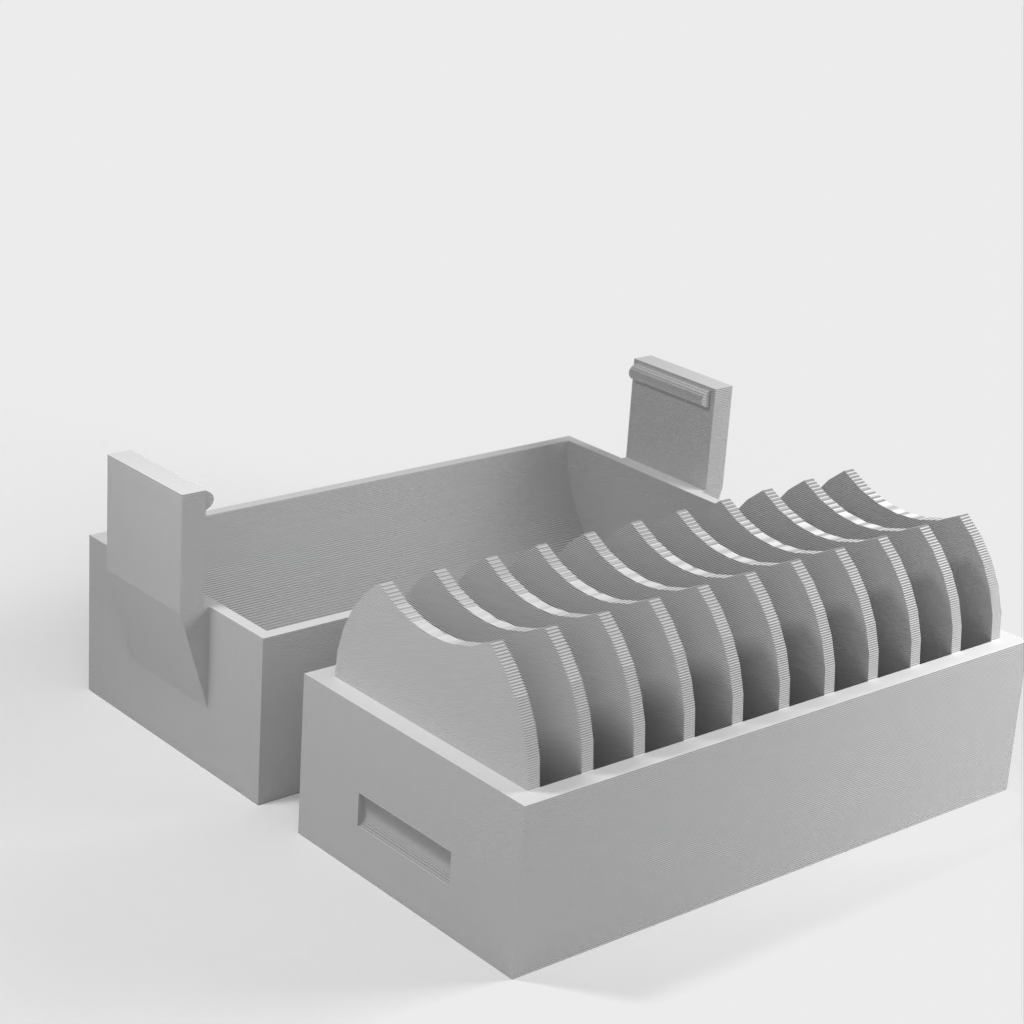 En liten hållare för 10 st. CR2032 myntbatterier. En ny version har lagts till med ett lock som gör det enklare att sätta i och ta ur batterierna. Locket har en klämma för att hålla batterierna på plats om det ramlar omkull.
