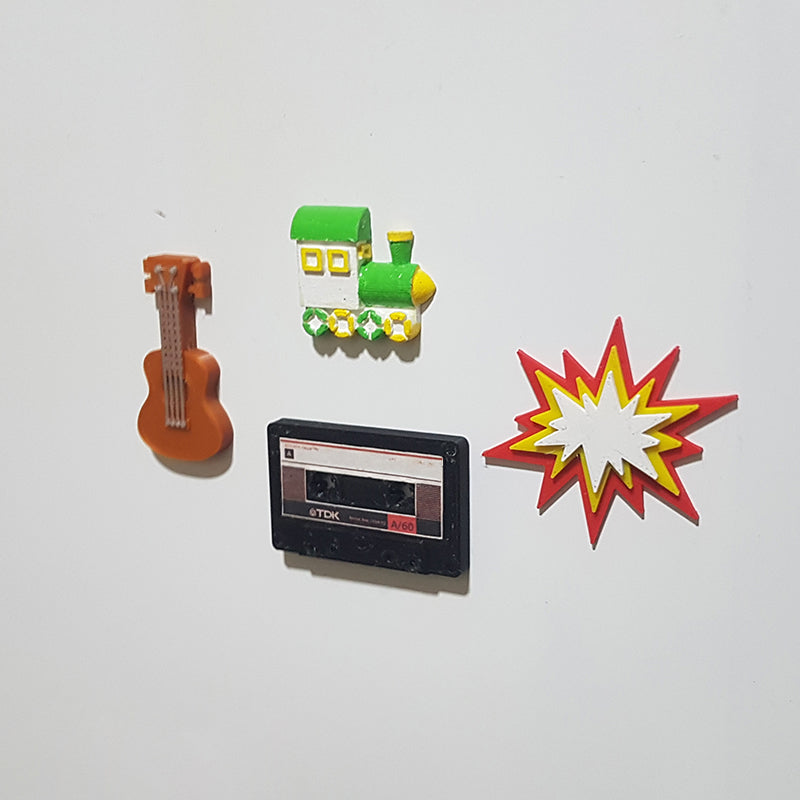 Handmålade tåg och gitarr kylskåpsmagneter med kassettmall