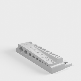 Insexnyckelhållare Skadis är en uppsättning nyckelhållare designade för att hantera insexnycklar. Den har siffror för att indikera storlekarna för enkel identifiering och placeras enkelt på vilken IKEA Skådis/Skadis panel som helst. Den här designen är lite mer fancy eftersom en del av fronten är avskuren i vinkel för att spara lite material.