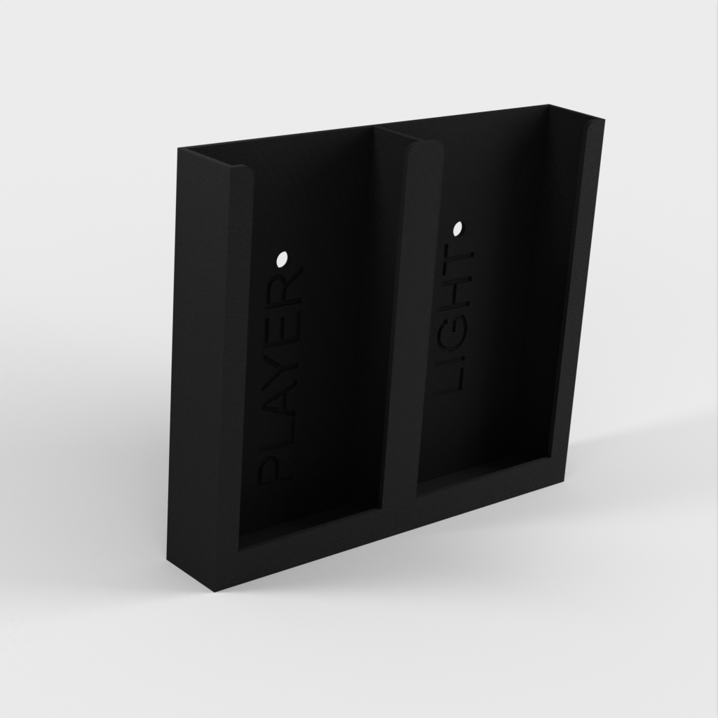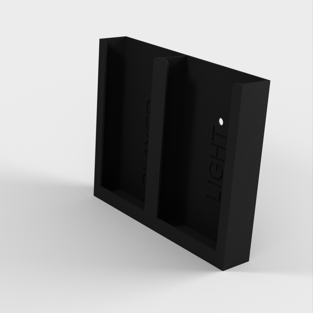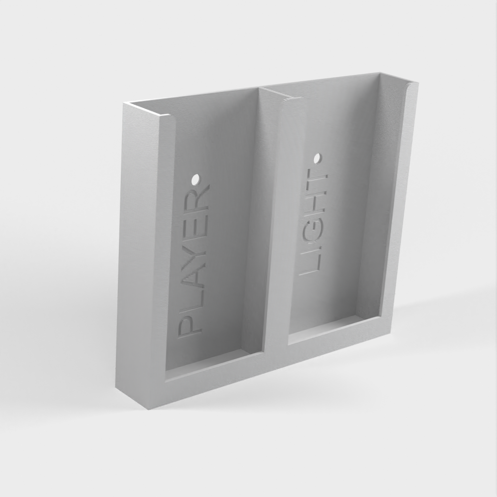 Detta är en enkel hållare som rymmer 2 fjärrkontroller. Den kan installeras antingen vertikalt eller horisontellt. Du kan fästa den antingen med två skruvar eller med dubbelhäftande tejp, vilket som passar ditt hem bäst.