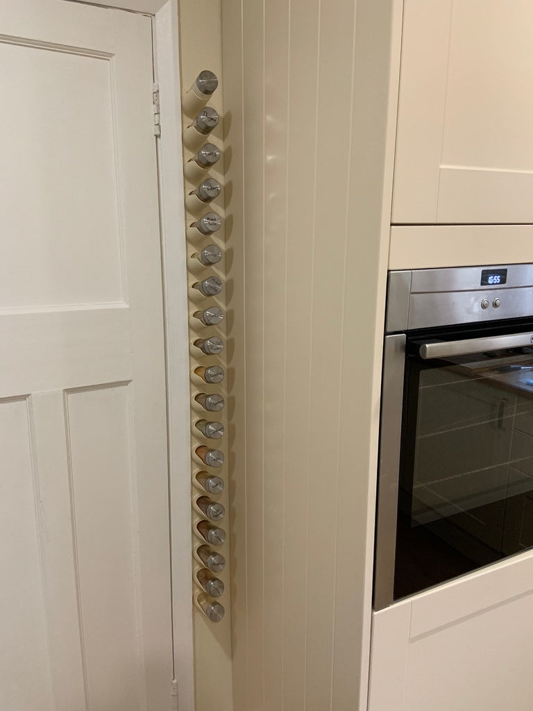 Hållaren kan fästas på väggen med ett skruvhål i botten, men den kan även enkelt monteras med ett lim som t.ex. "Inga spikar". Den specifika designen möjliggör enkel placering och borttagning av burkarna, så att du snabbt kan komma åt dina favoritkryddor. Den sekundära öppningen i hållaren ser till att luft kan komma ut när glasen sätts in, vilket underlättar användning och underhåll.