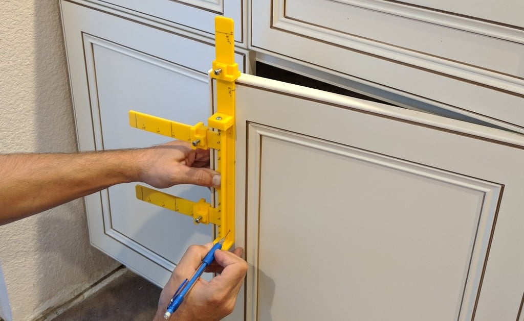 Mall för enkel och exakt placering av hål för skåphandtag. Mallen är justerbar och kan användas för handtagsavstånd på 3", 3,5", 3,75", 4", 4,5", 5", 5,5", 6", 6,5", 7", 7,5" respektive 16 cm. Med glidfunktion för exakt justering Kan användas för både 8-32 eller 1/4" maskinskruvar.