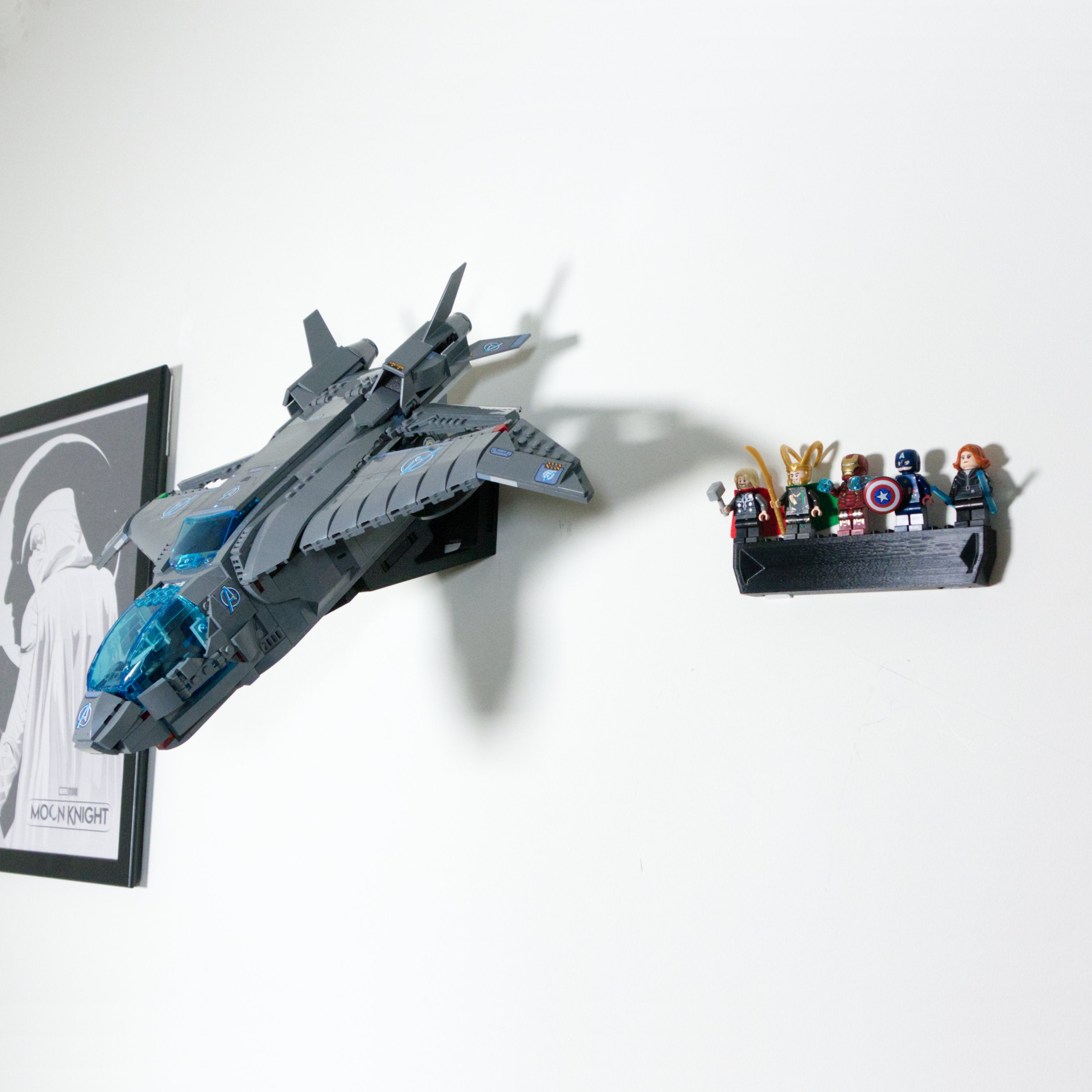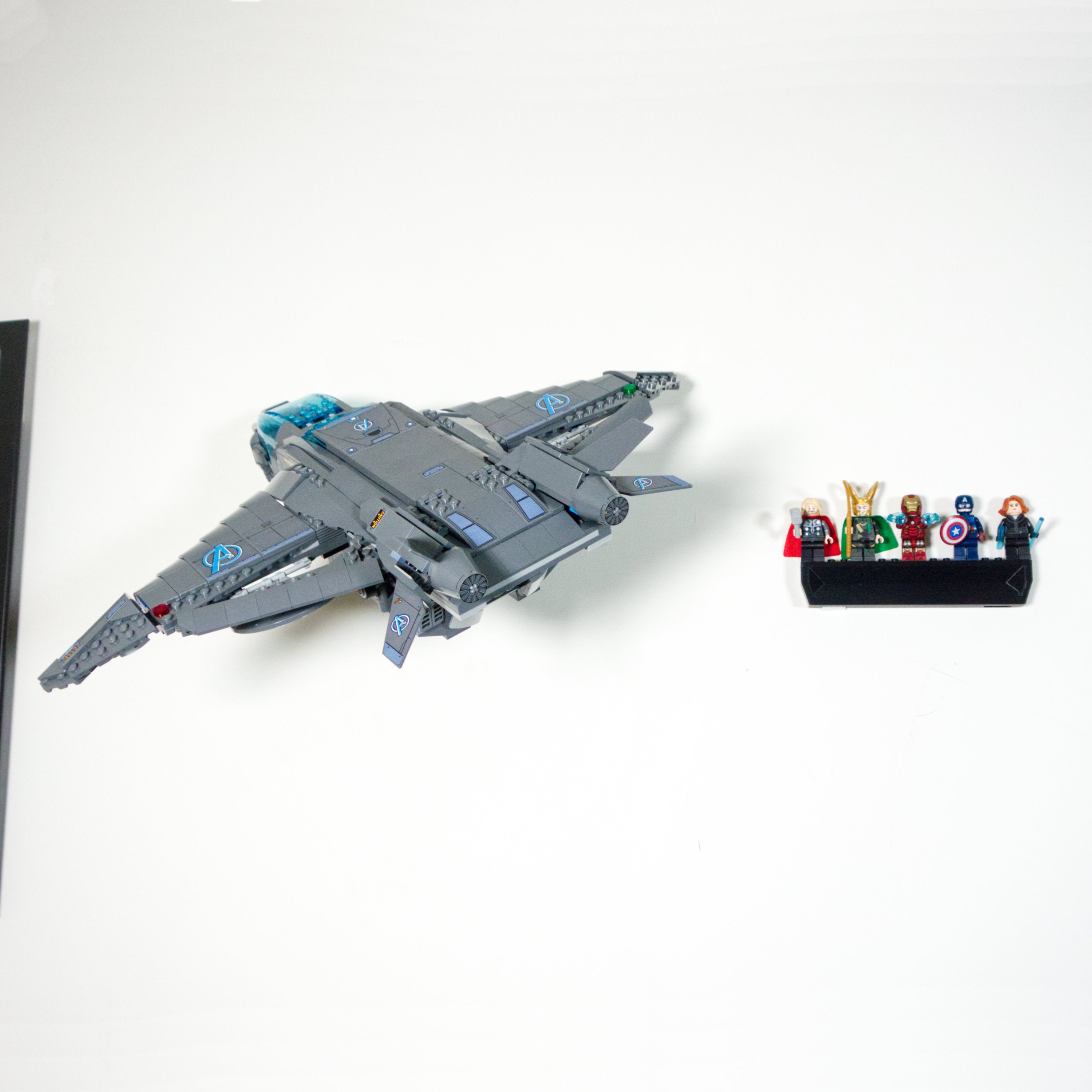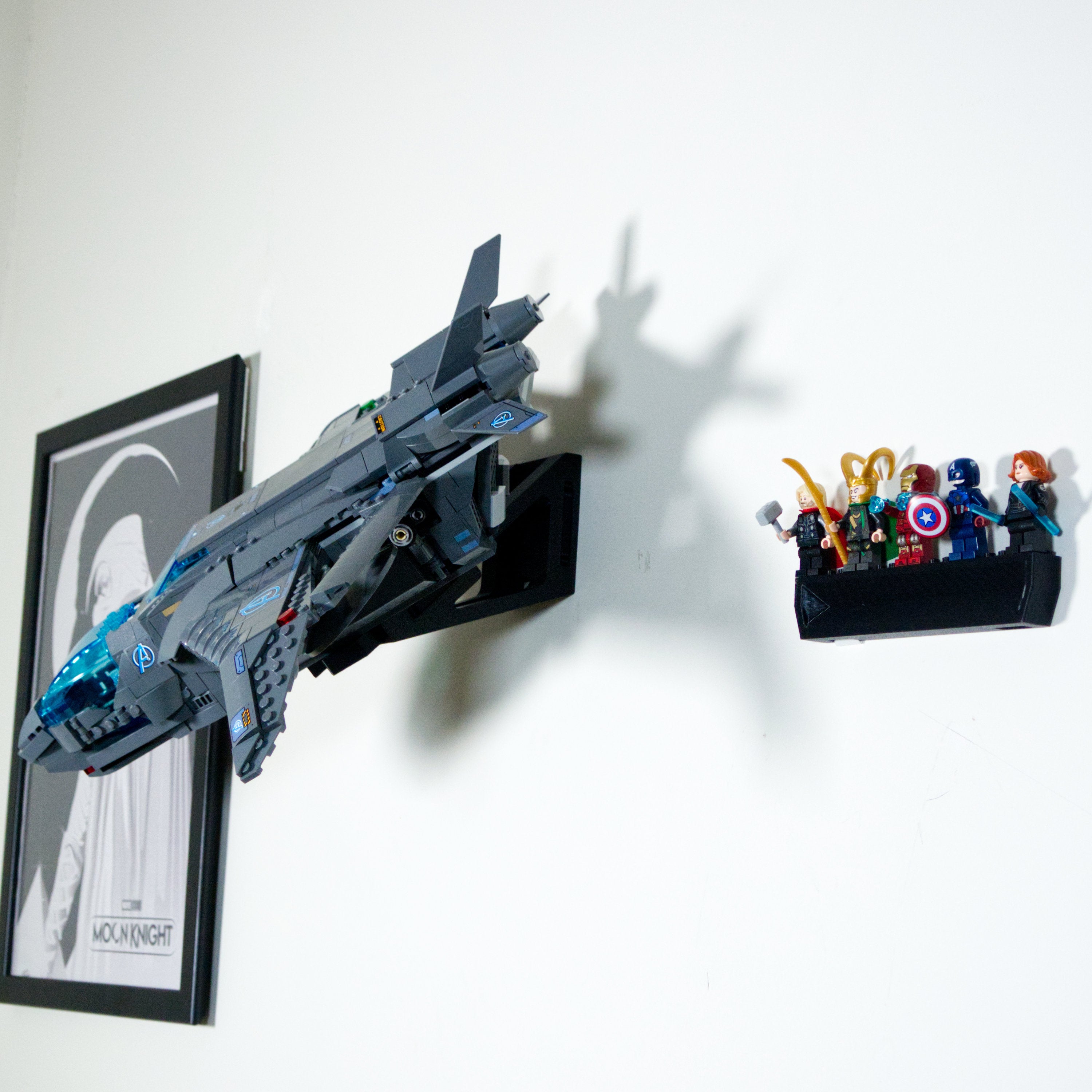 Med dette vægophæng til LEGO The Avengers Quinjet 76248 kan modellen udstilles sikkert på væggen. Designet gør det muligt at vinkle flyet mod venstre, højre eller lige fremad for optimal visning. Der medfølger desuden en holder til minifigurer, så hele sættet kan præsenteres samlet og organiseret.