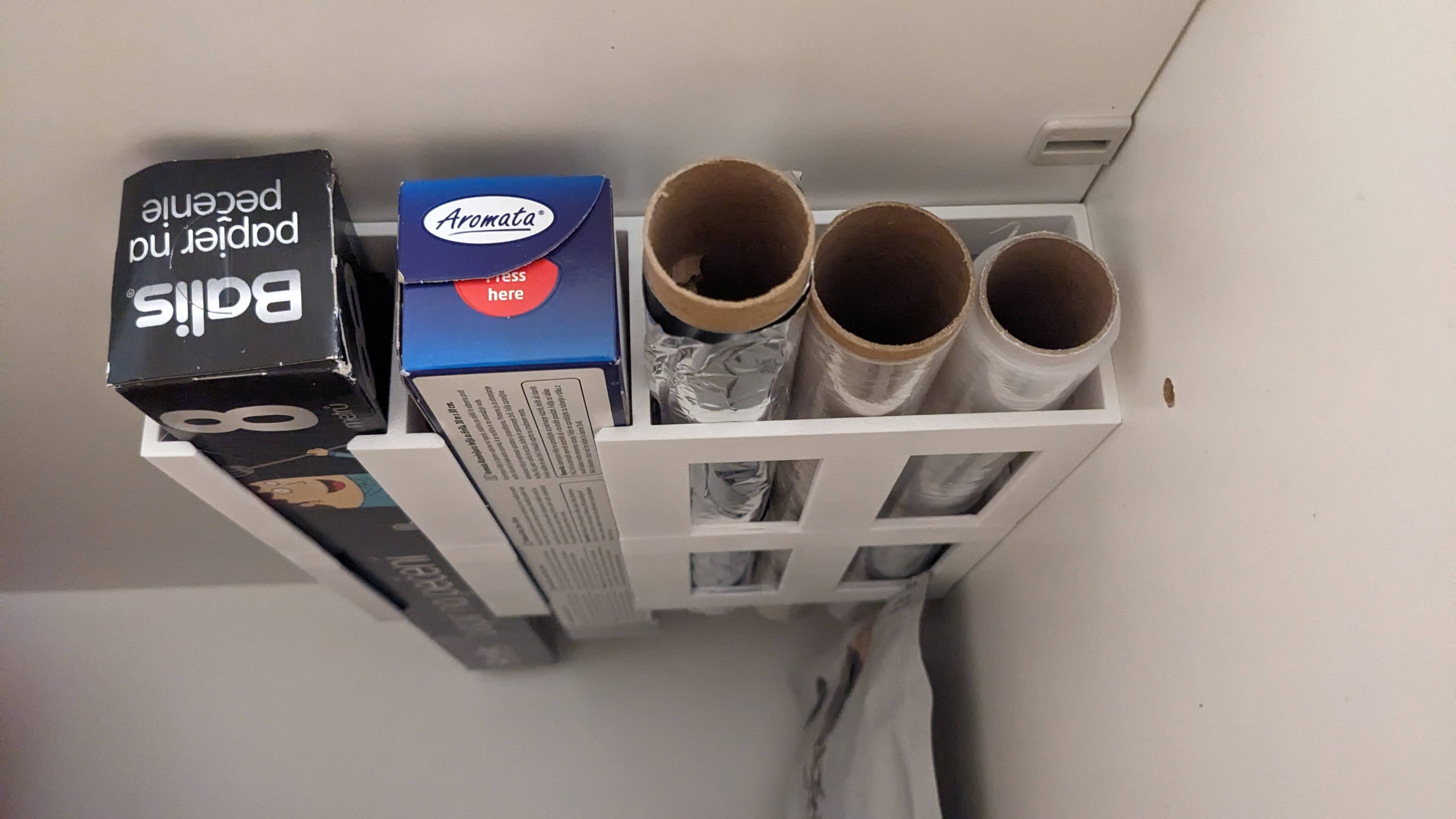 Denna praktiska foliehållare är utformad för att optimera utrymmet i ditt kök. Genom att montera den diskret under en hylla utnyttjas annars oanvänt utrymme effektivt. Denna smarta bricka ger dig en dedikerad plats för att förvara folie, plastfolie eller bakplåtspapper, vilket bidrar till mer ordning och översikt. Den robusta konstruktionen säkerställer att dina rullar förblir på plats och är lättillgängliga när du behöver dem under matlagningen. Det är en enkel och funktionell platsbesparande lösning som bidrar till en mer organiserad och effektiv köksmiljö.