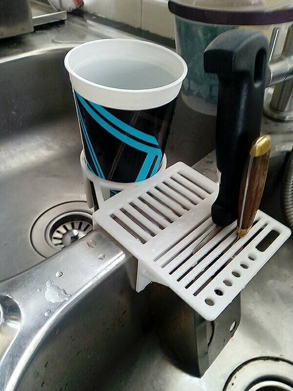 Denna hållare är utformad för att optimera utrymmet runt din köksdisk, särskilt för dubbla diskhoar med en 5 cm kant. Den erbjuder en organiserad lösning för att förvara en liten flaska diskmedel, samtidigt som den erbjuder en dedikerad plats för knivar och ätpinnar. Genom att hålla dessa ofta använda föremål samlade och inom räckhåll bidrar hållaren till en snygg och funktionell köksarbetsyta. Den enkla designen integreras diskret i inredningen och hjälper till att undvika röran på köksbänken.