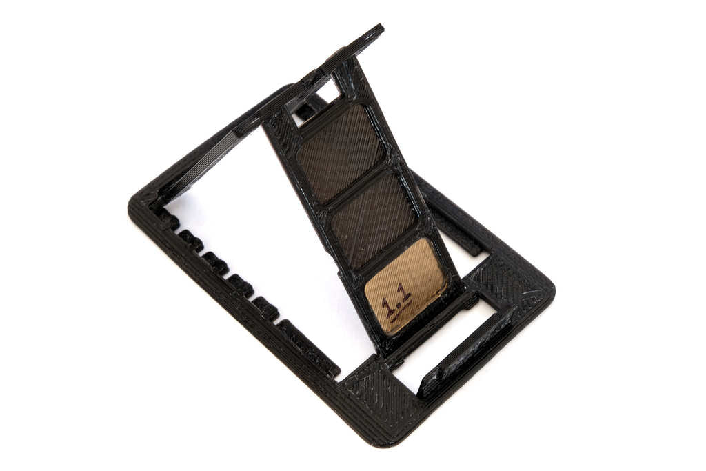 Detta är en kreditkortsstorlek, 2 mm tjock, hopfällbar telefonhållare designad för att lätt passa in i vilken tunn plånbok som helst. Denna behändiga lilla pryl är baserad på denna telefonhållare . Den är bekvämt enkel att ta med överallt och klarar de flesta smartphones.