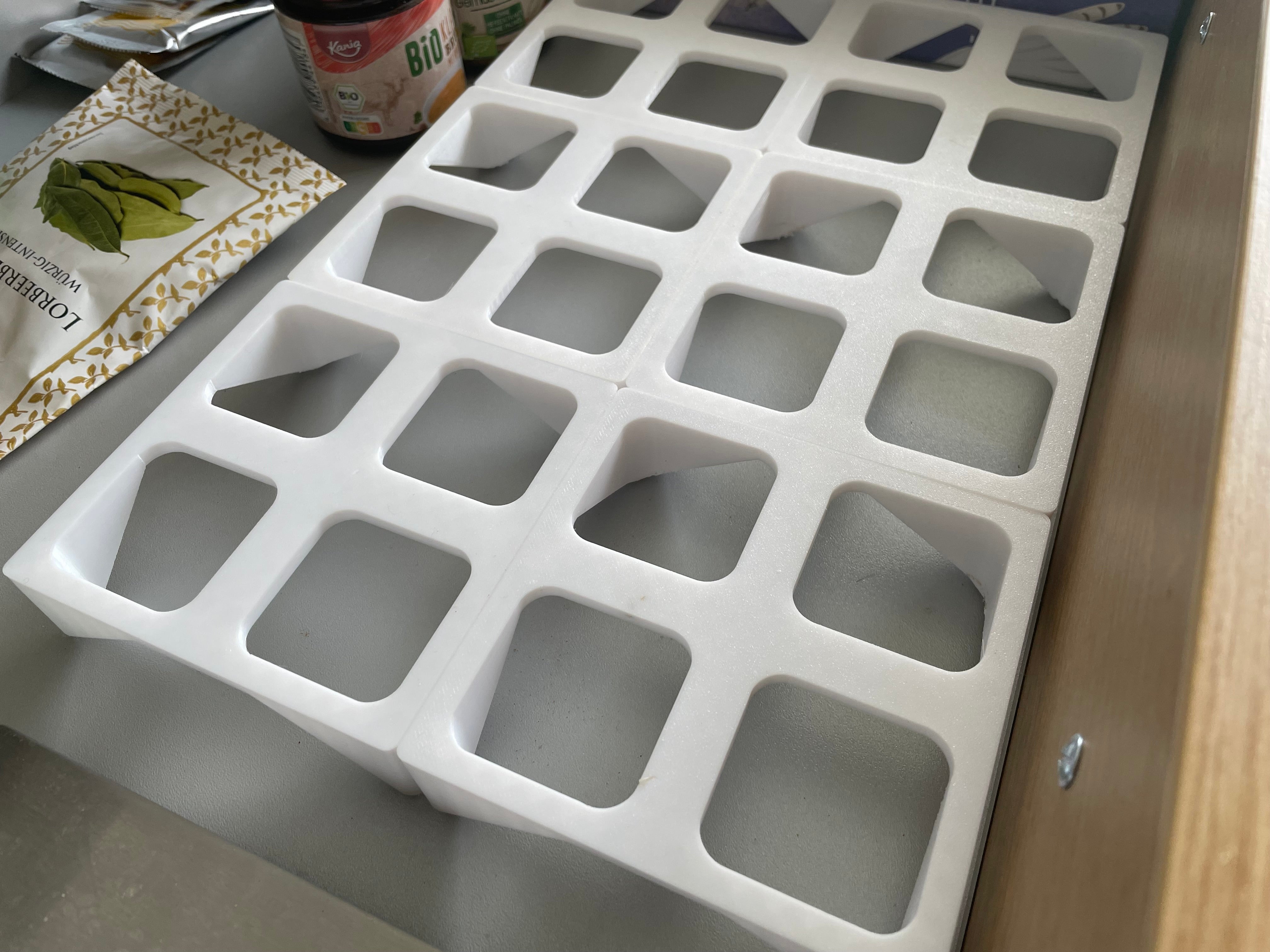 Organisera dina kryddor med denna praktiska kryddburkförpackning designad för lådor. Det ger ett effektivt sätt att hålla dina kryddor på plats och lättillgängliga. Denna variant är idealisk för rektangulära kryddburkar, men den kan även anpassas till runda kryddburkar, vilket gör den flexibel för olika förvaringsbehov.