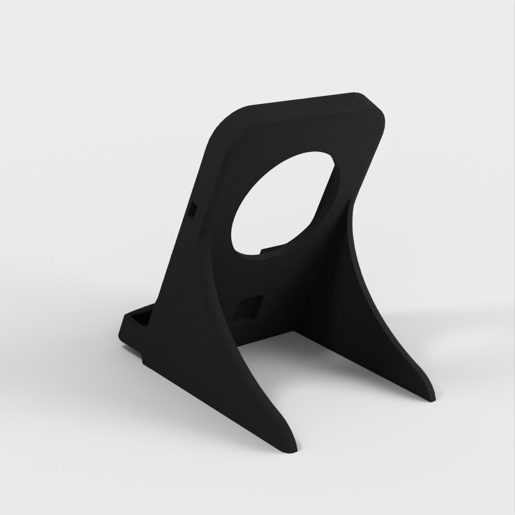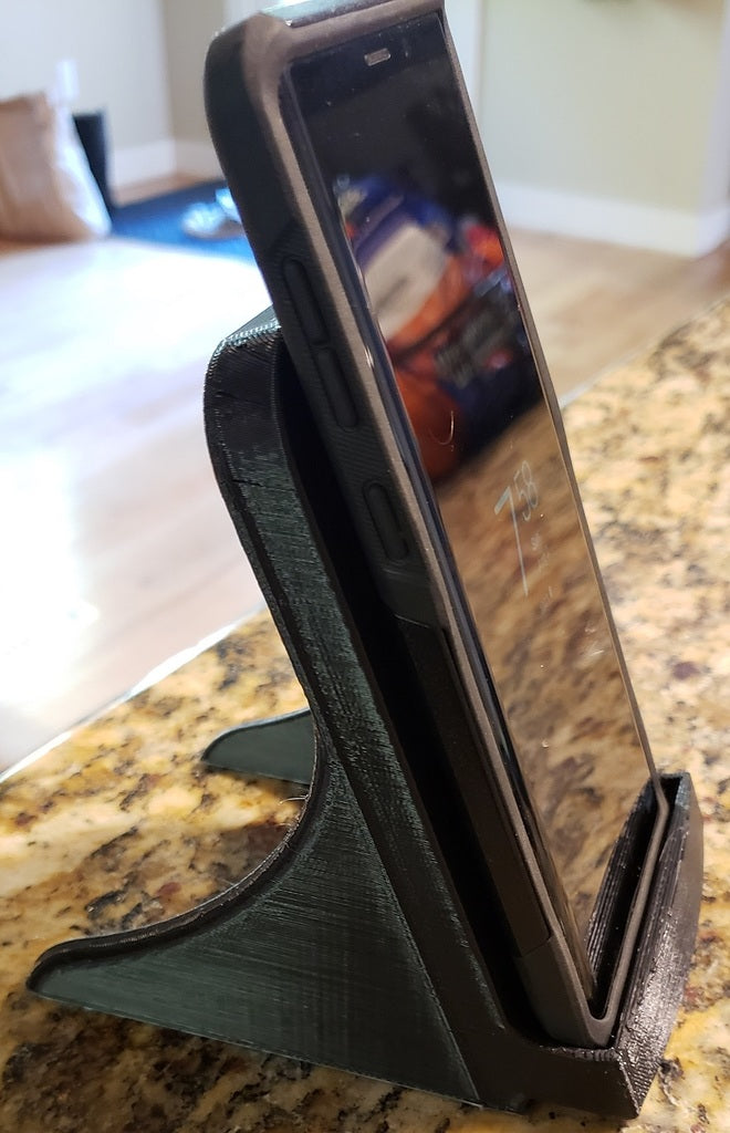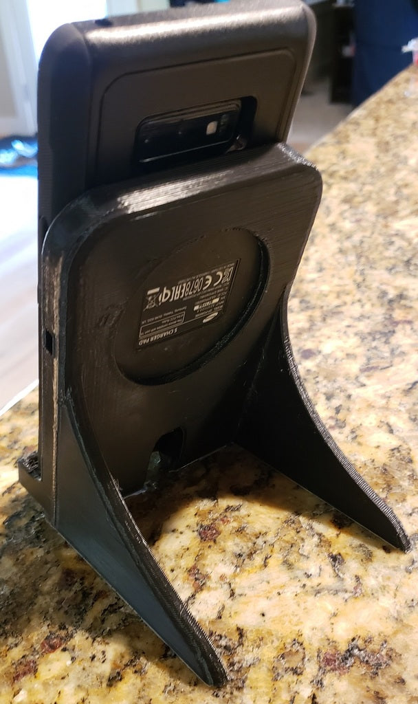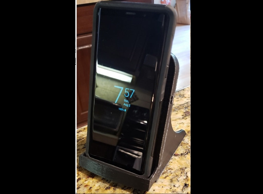 Detta är ett Samsung Galaxy Note 9-laddarställ designat för att passa en Samsung EP-PG900IBE fyrkantsladdare. Den är speciellt anpassad för att rymma telefonen medan den fortfarande är i sitt robusta Otterbox-fodral. Högtalarhålet har flyttats ordentligt i botten och laddaren har höjts för att fungera med Notes interna trådlösa laddare. Hela enheten är något mer skrymmande och tar ca. 3,5 timmar att skriva ut med en hastighet av 80 mm/s vid 0,3 lagers höjd med 20 % fyllning.