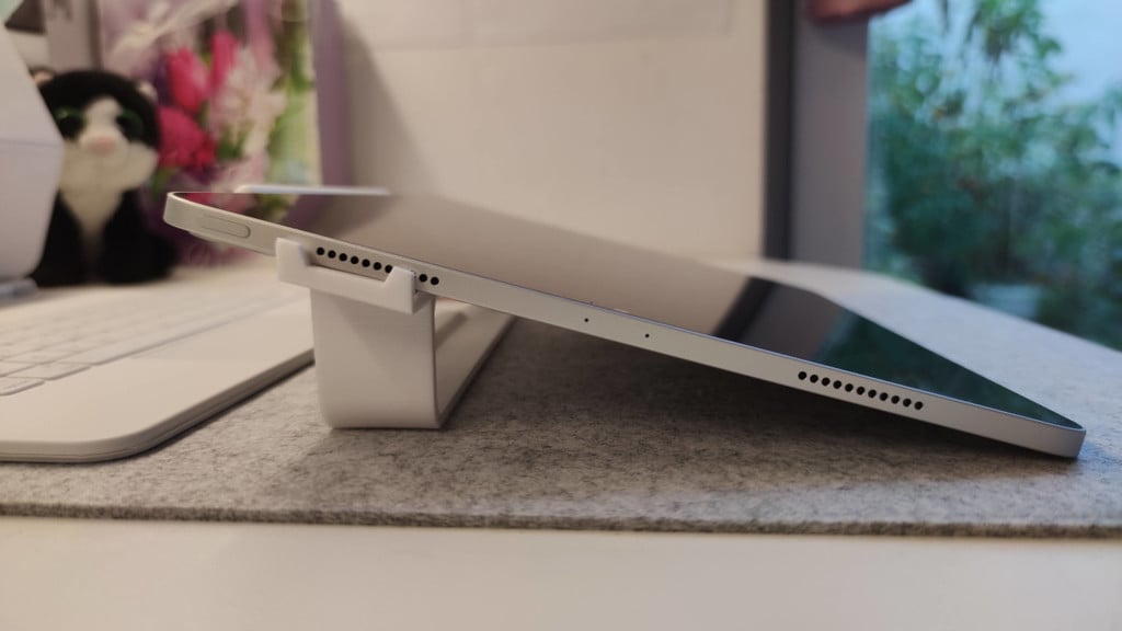 Stativet har en exakt utskärning för högtalarna, vilket säkerställer att ljudet förblir klart och fritt under användning. Ett styvare och bredare bottenfäste bidrar till förbättrad stabilitet och håller din surfplatta säker även under intensiva kreativa sessioner. De avfasade kanterna ger en smidig och bekväm design.