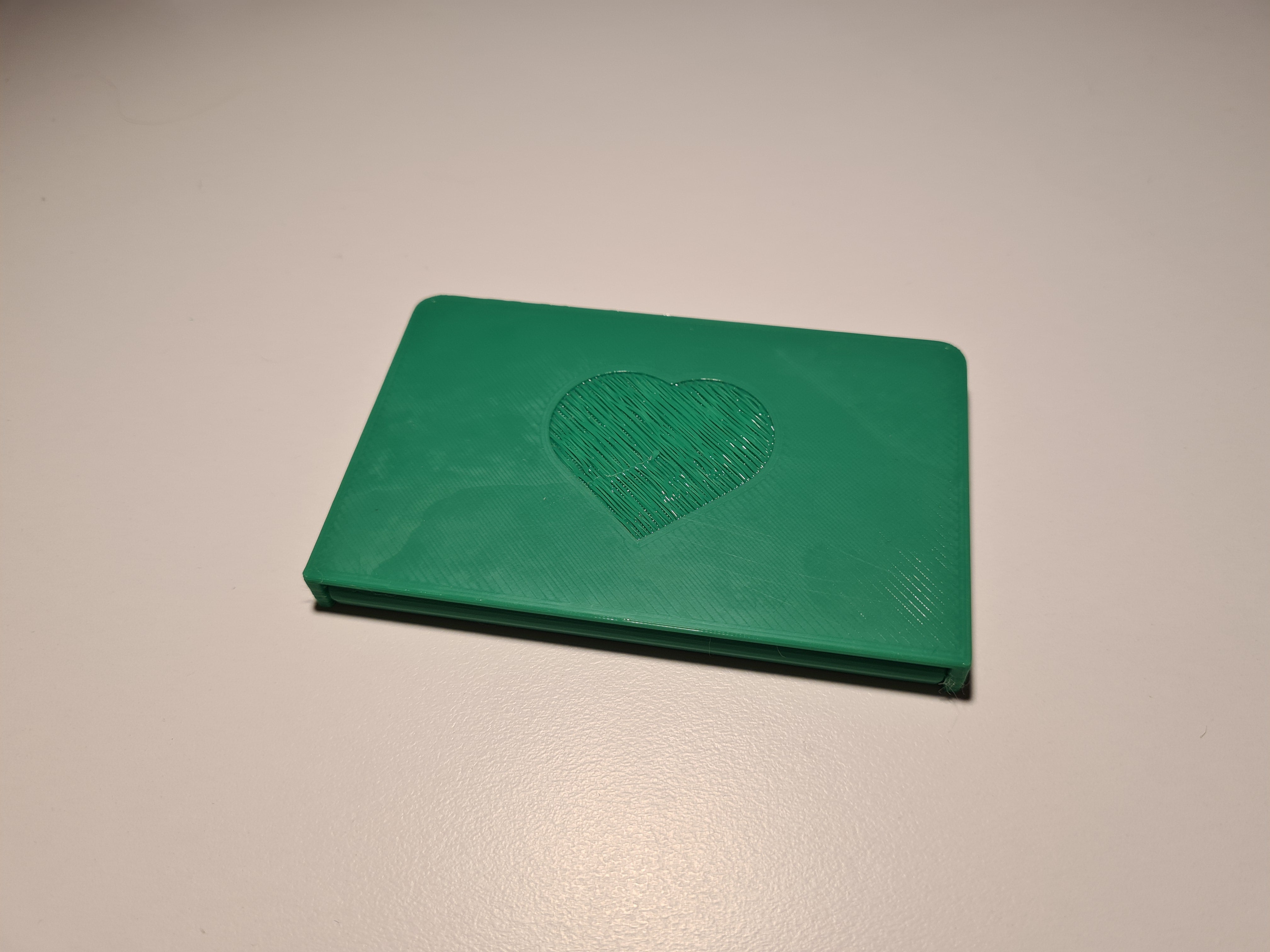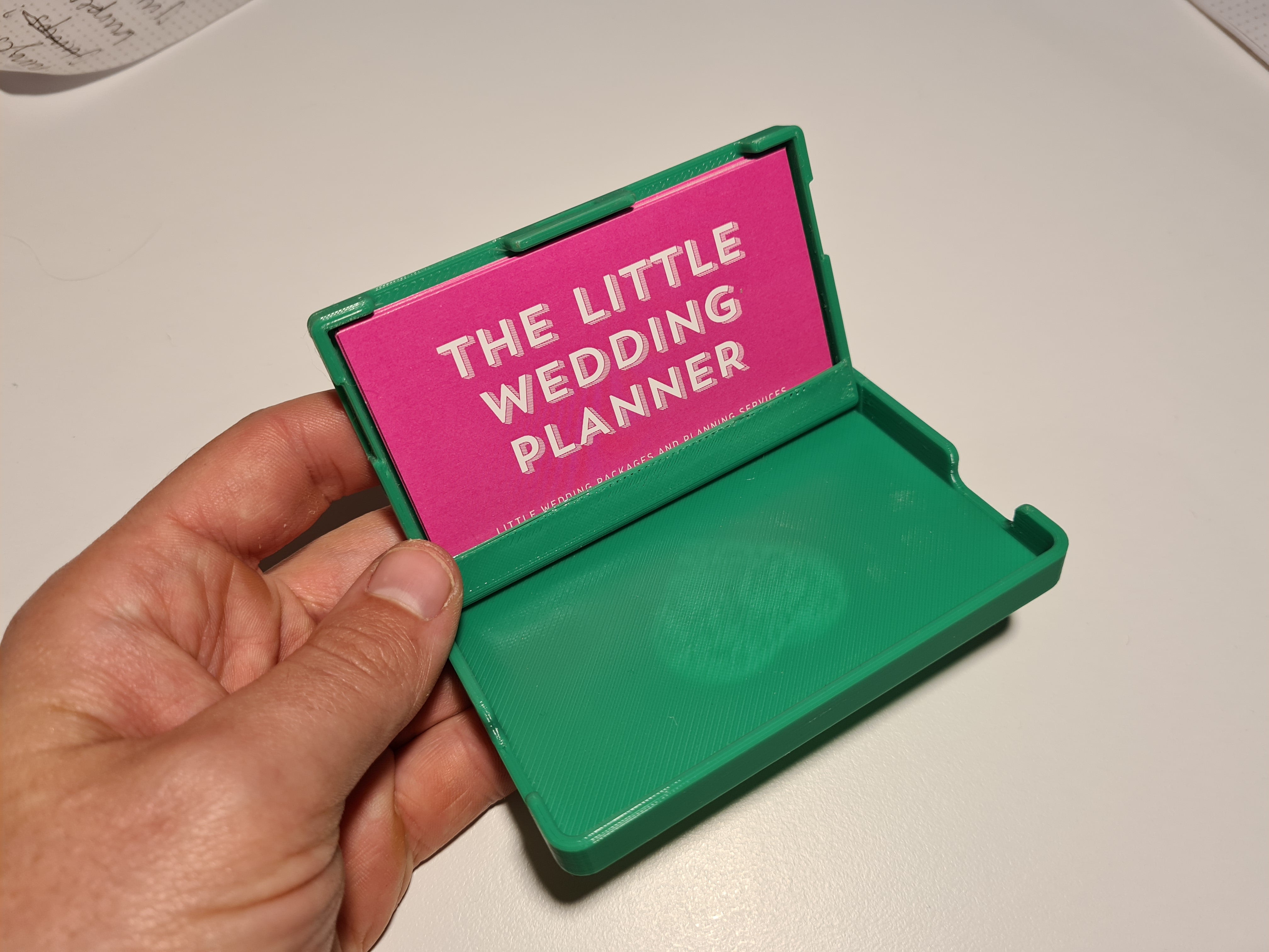 Denna lilla visitkortshållare skyddar dina kort i fickan eller väskan. Den stängs med ett klick så att dina kort inte rinner ut i väskan. Den öppnas i clamshell-stil för att avslöja korten. En version av locket med ett hjärta på och en tom version ingår. Du får gärna sätta din logotyp eller namn på den.
