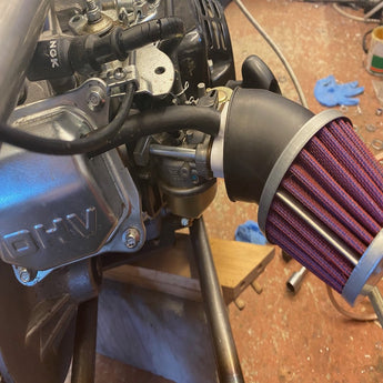 Denna uppdaterade luftfilteradapter är designad för Honda GX160, GX200, Predator och liknande klonmotorer och erbjuder en bekväm lösning för att installera ett standard koniskt eller högpresterande luftfilter. Adaptern låter dig ta bort den ursprungliga luftfilterlådan och är lämplig för dem som vill optimera motorns luftflöde.