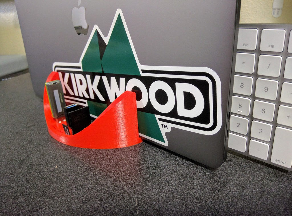 Med dedikerade platser för ett Apple-märkt tangentbord, två USB-A-enheter (t.ex. USB-minnen), två USB-C-adaptrar, ett SD-kort och tre Micro SD-kort, bidrar den här lösningen till en mer organiserad och funktionell arbetsyta genom att samla viktiga tillbehör på ett ställe.