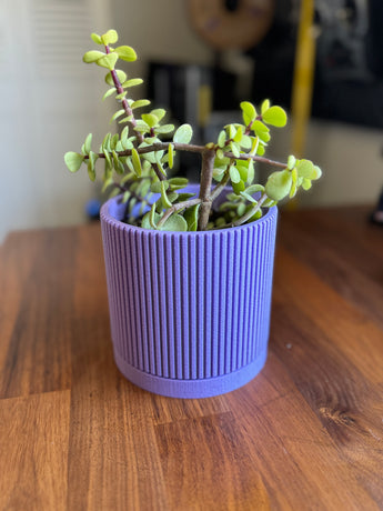 Ge ditt hem en touch av mitten av århundradets charm med denna 4 3/4 tums växtkruka med eleganta linjära spår. Designad för att rymma dina favoritväxter, den här eleganta planteringsmaskinen har en valfri droppbricka för att hjälpa till att fånga upp överflödigt vatten, vilket säkerställer att dina växter trivs utan att röra sig.