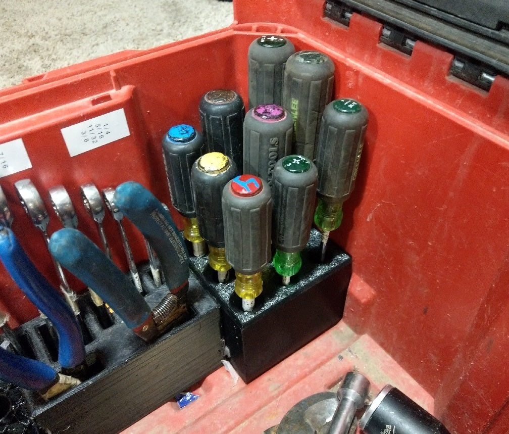 Organisatorn är från början dimensionerad för att rymma en mängd olika vanliga skruvmejslar, inklusive fyra Greenlee-skruvmejslar och fem Klein-mutterdragare. Denna skruvmejselhållare säkerställer att dina verktyg sitter säkert på plats och förhindrar att de ligger löst omkring i lådan.