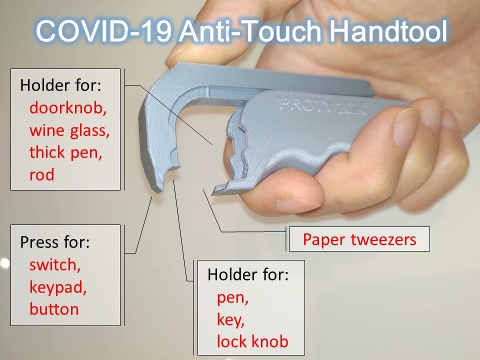 Detta multifunktionella COVID-19 no-touch-verktyg är designat för att göra vardagen säkrare och bekvämare. Verktyget innehåller flera viktiga funktioner såsom dörröppnare, vinglashållare, låsknappsvängare, tryckknappar, tangentbord, knappar, pennhållare, papperspincett, nyckelhållare och stavhållare.