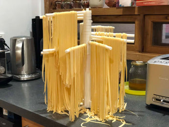 Detta torkställ med 16 armar är perfekt för att effektivt torka pasta efter tillagning. Med sin praktiska design kan du enkelt ställa upp det när du behöver göra pasta och sedan ta isär det för enkel förvaring när det inte används. Den kompakta designen gör att du kan torka större mängder pasta samtidigt, vilket är perfekt för dig som älskar att göra hemlagad pasta. Oavsett om du gör tagliatelle, fettuccine eller spaghetti, hjälper detta torkställ dig att uppnå perfekt konsistens samtidigt som det säkerställer att din pasta inte klibbar ihop.
