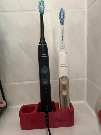 Denna hållare erbjuder en praktisk lösning för att förvara och ladda två Philips Sonicare-tandborstar samtidigt. Den är utformad för att ge en dedikerad plats för dina tandborstar, vilket bidrar till ett mer organiserat badrum. Den integrerade laddningsfunktionen säkerställer att dina tandborstar alltid är fulladdade och redo att användas när du behöver dem för din dagliga munhygien.