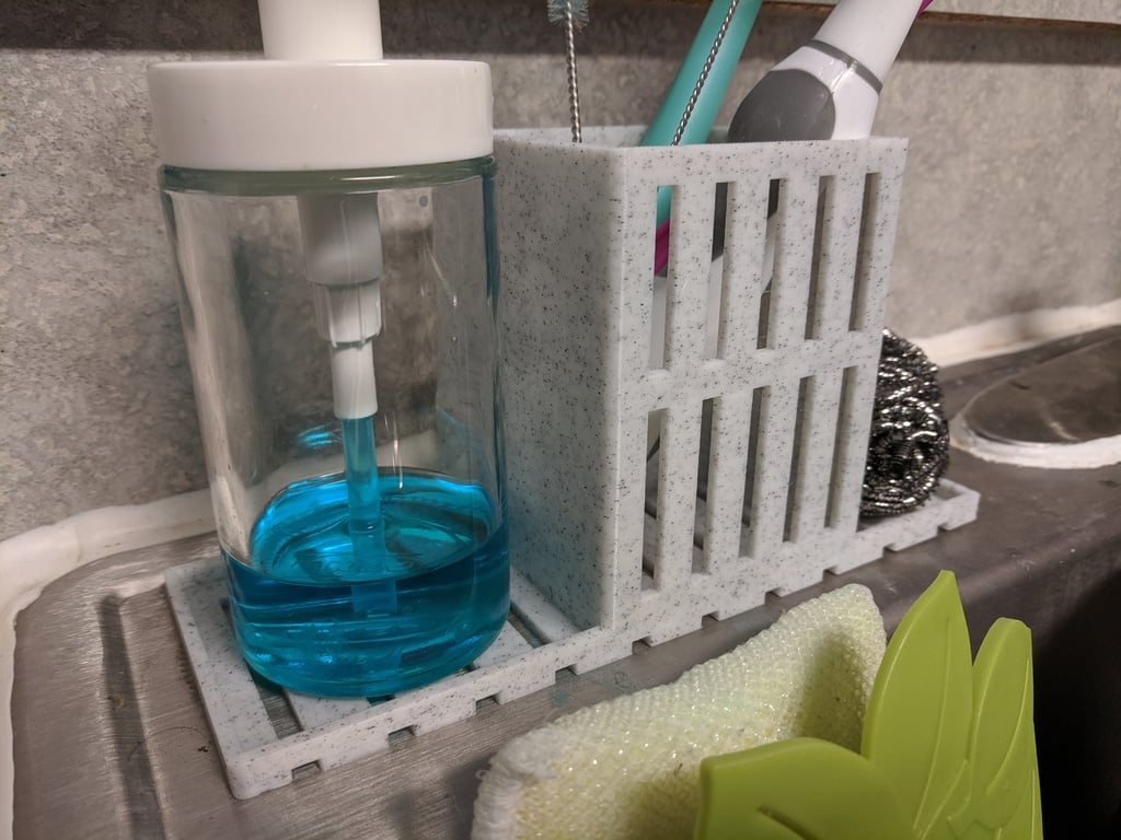 Praktisk diskbänksbehållare för diskmedel och svamp