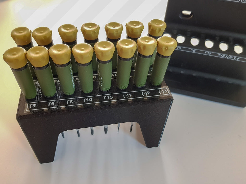 Detta är en skruvmejselhållare för Proxxon skruvmejselset. Den är designad för att stå fint på bordet, även om setet ursprungligen är avsett för väggmontering. Hållaren förhindrar skruvmejslar från att falla till golvet och gör det lättare att organisera dina verktyg.