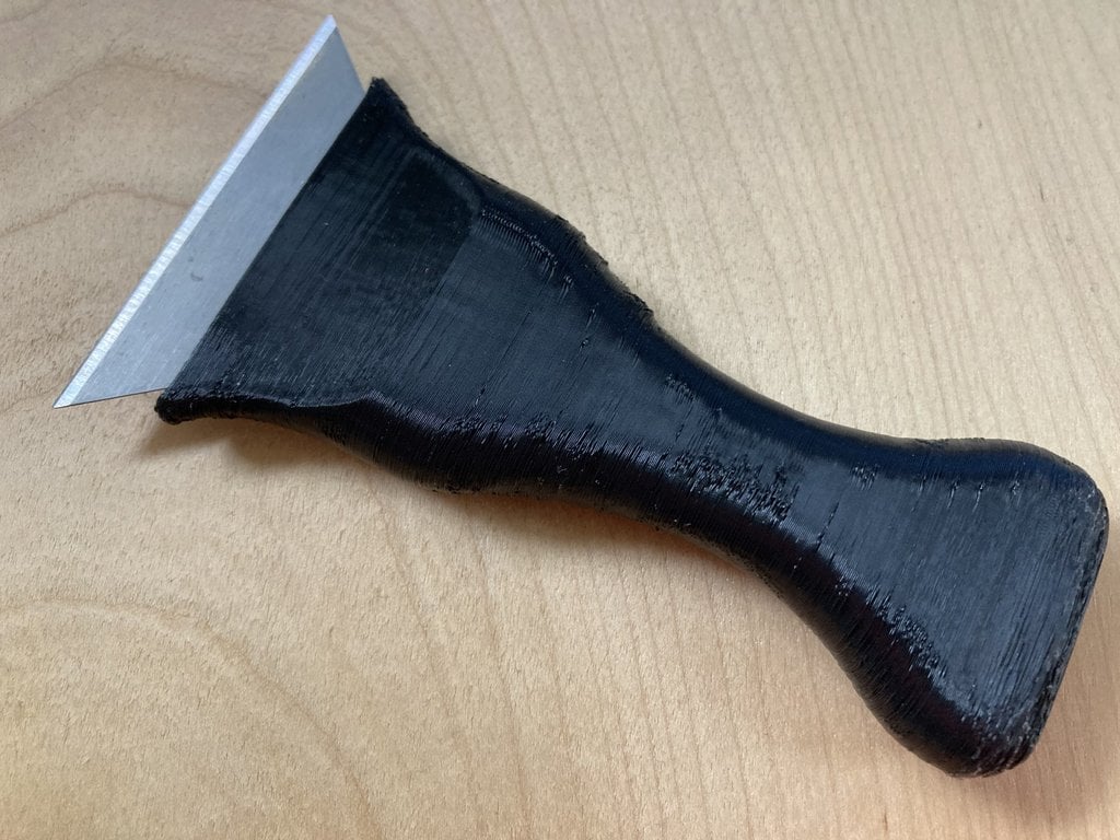 Ett rakbladshandtag som är robust och effektivt för att rengöra gamla limrester från din 3D-skrivares glasbädd. Det hjälper också till att ta bort envisa tryck från glasbädden. Tryck bara in bladet i handtaget så låses det. Både vassa och envisa tryck kan enkelt tas bort genom att trycka ner handtaget mot glasbädden eller genom att försiktigt knacka på handtagets breda ände för att lossa trycket från glasbädden. Handtaget har även en version med hål så att du kan hänga upp den.