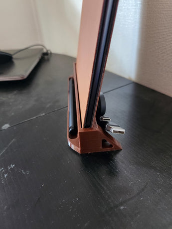 Detta stativ är utformat för att placera din reMarkable 2 i en stabil och bekväm vinkel, vilket stöder ett bekvämt arbetsflöde när du antecknar, ritar eller läser. Stativet inkluderar smarta lösningar för förvaring av viktiga tillbehör: det finns plats för ditt fodral, en dedikerad hållare för din laddningskabel och en utbytbar kontakt. Denna design hjälper till att hålla din arbetsstation organiserad och säkerställer att din reMarkable 2 och dess tillbehör är samlade och lättillgängliga. Den funktionella formen gör den till ett praktiskt tillskott för alla användare som vill ha en mer effektiv användning av sin surfplatta.