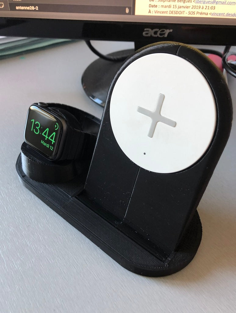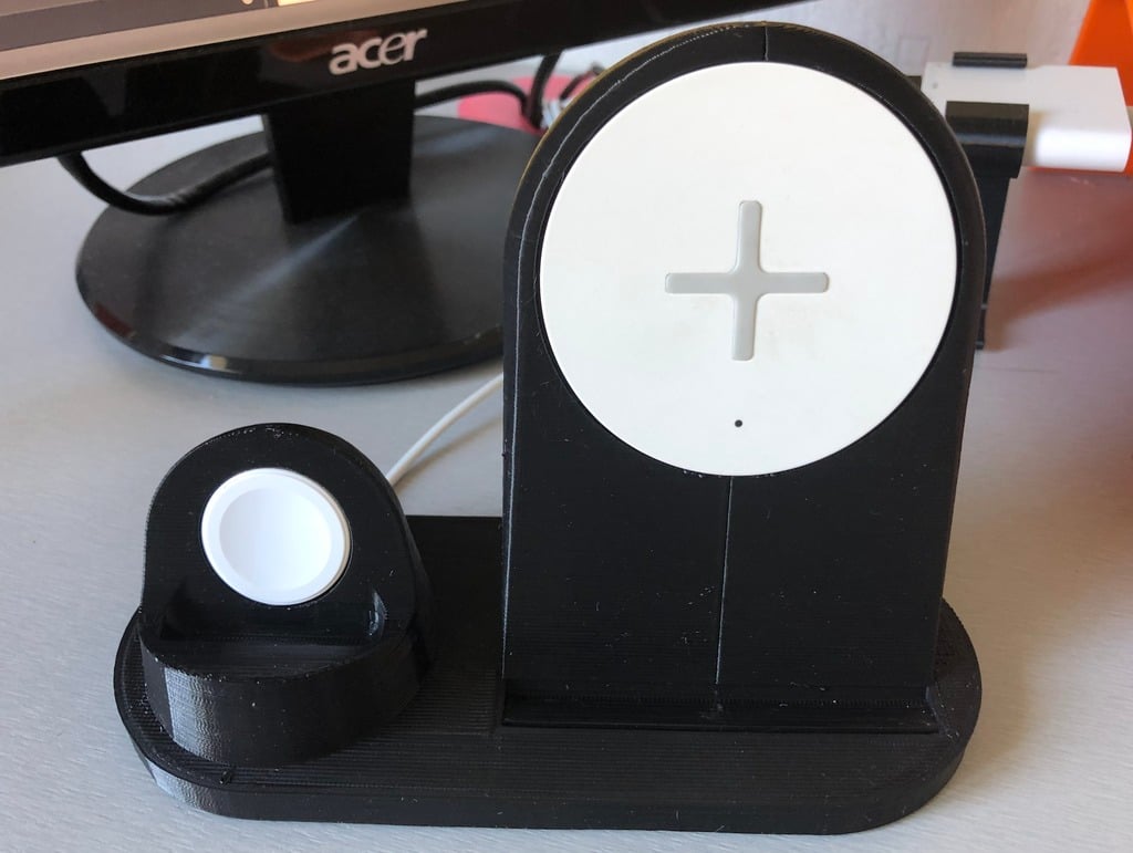 Denna runda laddningsstation är utformad för att ge en organiserad och bekväm laddningslösning för dina Apple-enheter och erbjuder ett dedikerat utrymme för både din Apple Watch och en rad iPhone-modeller, inklusive iPhone 8 Plus, iPhone X, iPhone XR och iPhone XS Max.