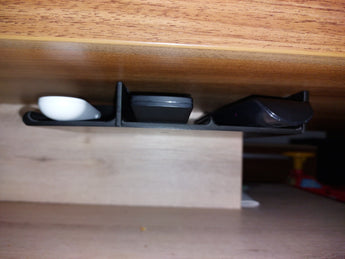 Denna fjärrkontrollhållare är utformad för att skapa ordning och minimera röran i ditt vardagsrum genom att erbjuda en smart förvaringslösning för dina fjärrkontroller och små elektroniska enheter. Hållaren monteras diskret under ett bord eller en hylla med hjälp av dubbelhäftande tejp, vilket säkerställer att dina fjärrkontroller är nära till hands när du behöver dem, men utom synhåll när de inte används.