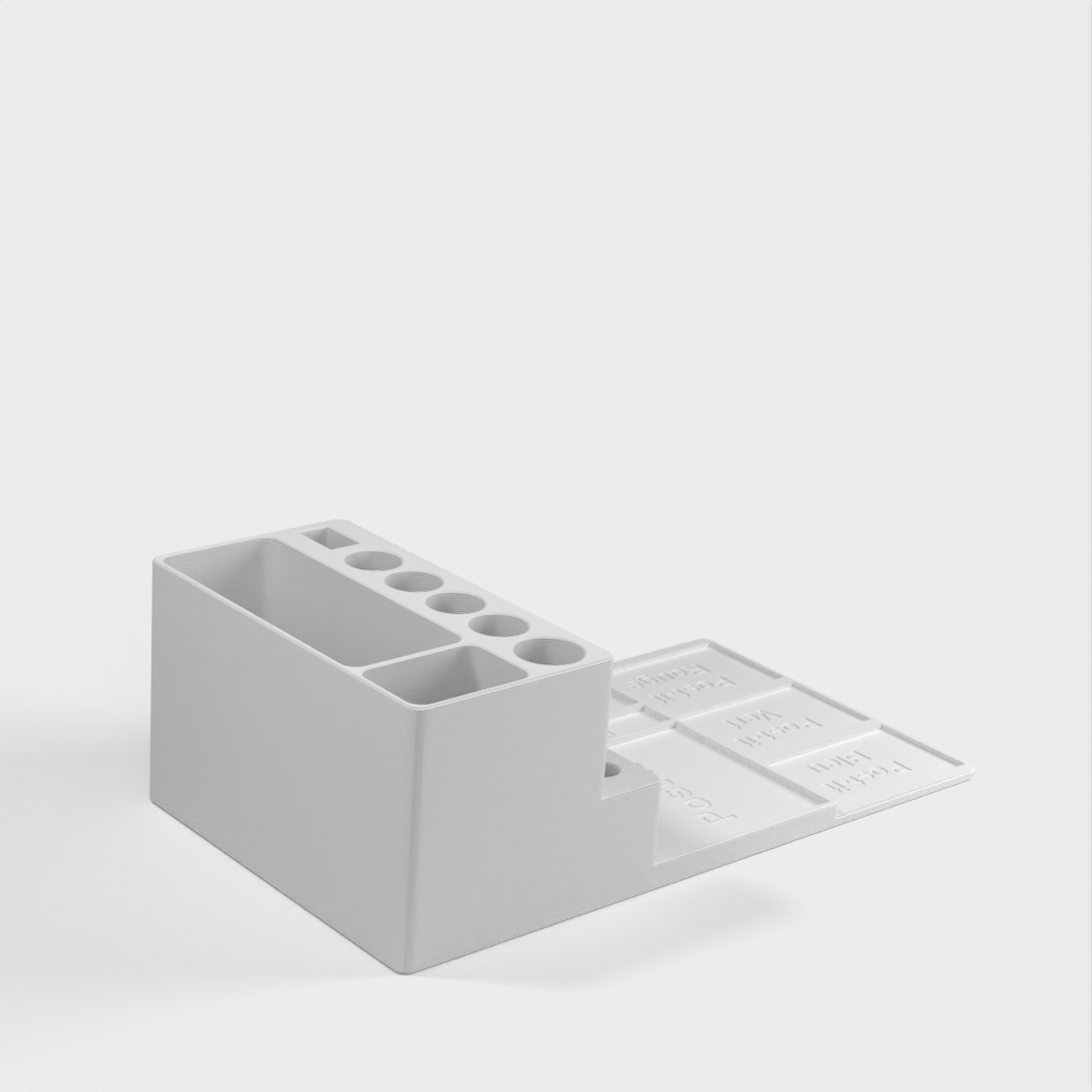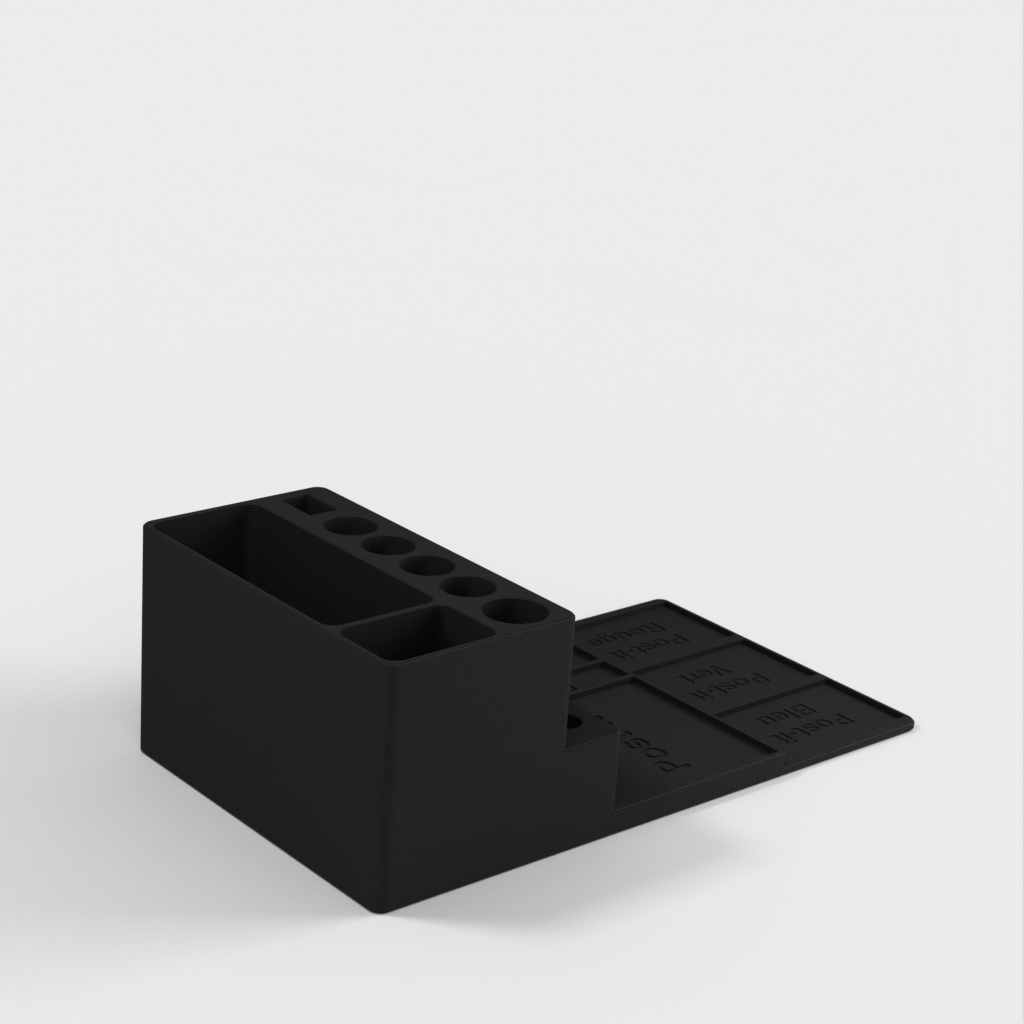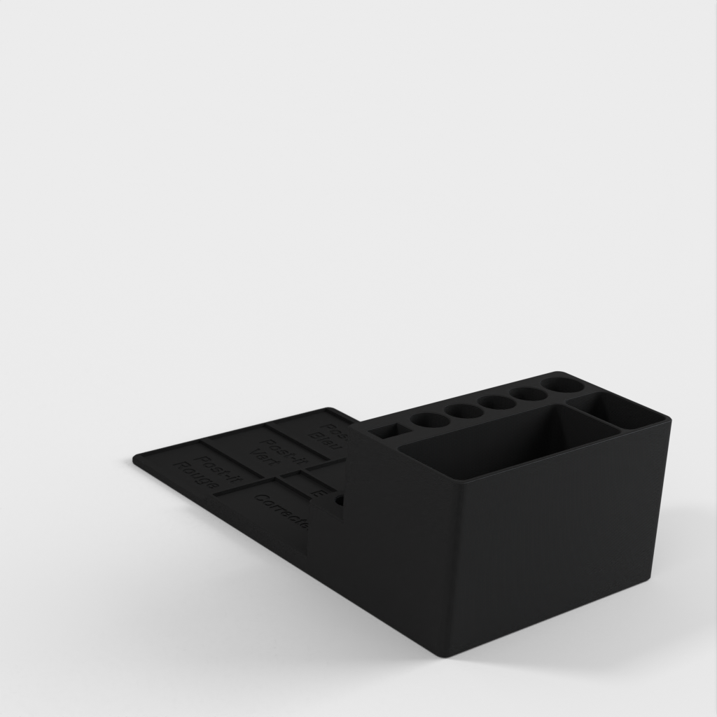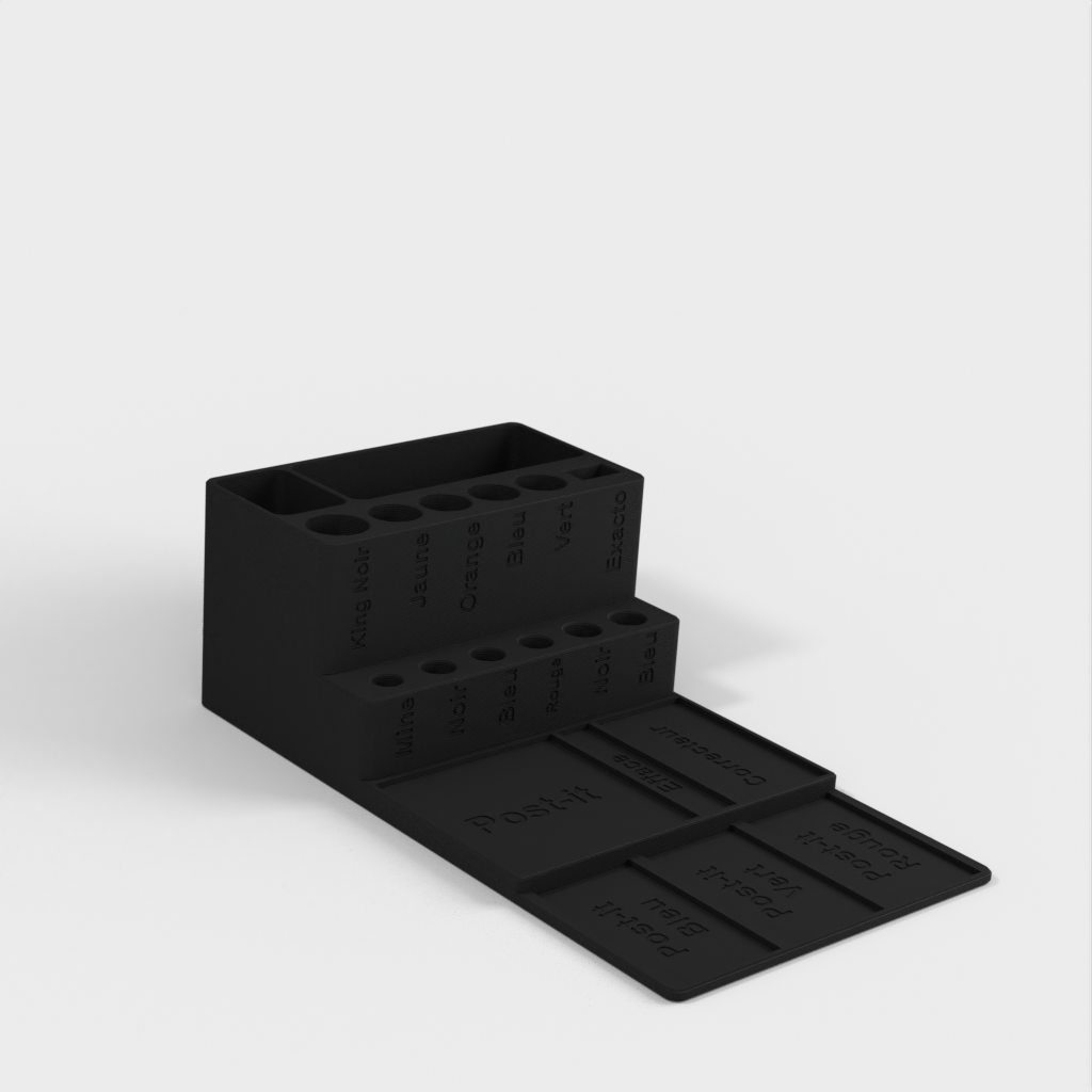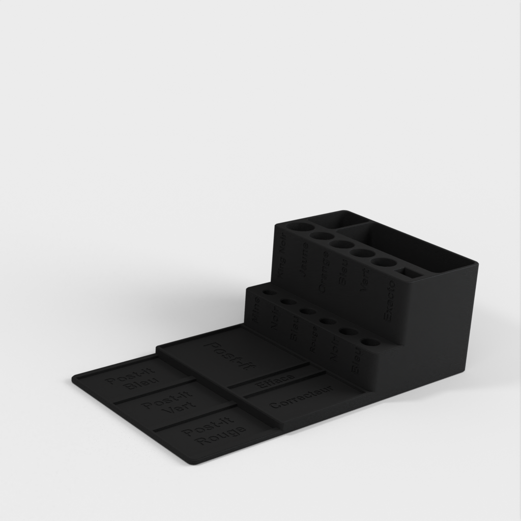 Detta är en skrivbordsarrangör designad för att effektivt organisera dina dagliga kontorsverktyg. Denna arrangör underlättar förvaring av olika verktyg såsom pennor, pennor, markörer och andra skrivartiklar som är nödvändiga för daglig användning på kontoret. Håll ditt skrivbord snyggt och städat och öka din produktivitet genom att hålla dina kontorsverktyg inom räckhåll.