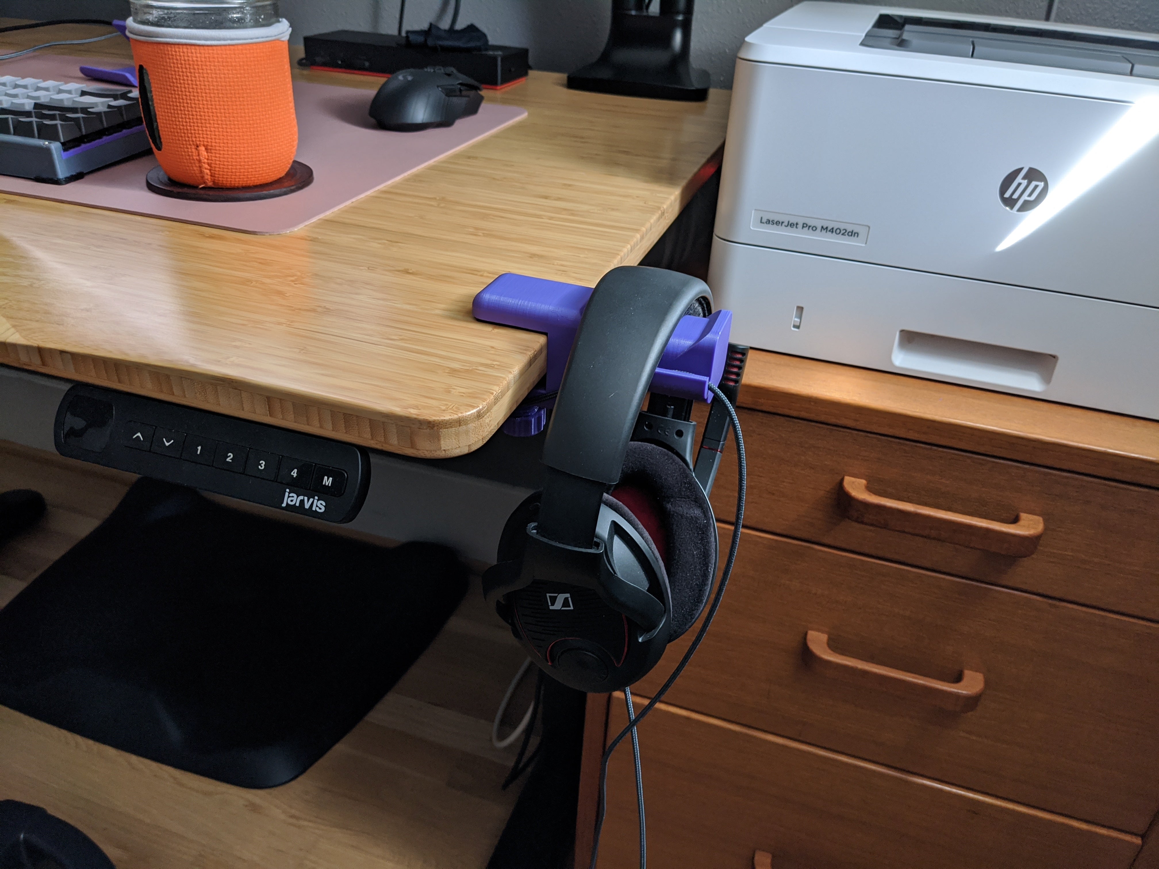 Detta är en hörlurshängare som kan monteras på ett skrivbord. Den kan parametriskt anpassas via Fusion 360 för att möta dina behov. Efter utskrift är det bäst att montera något med lite grepp på de ytor som kommer i kontakt med skrivbordet. Detta säkerställer att hängaren sitter stadigt fäst vid skrivbordet och inte glider runt.