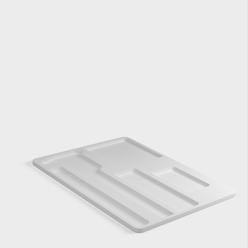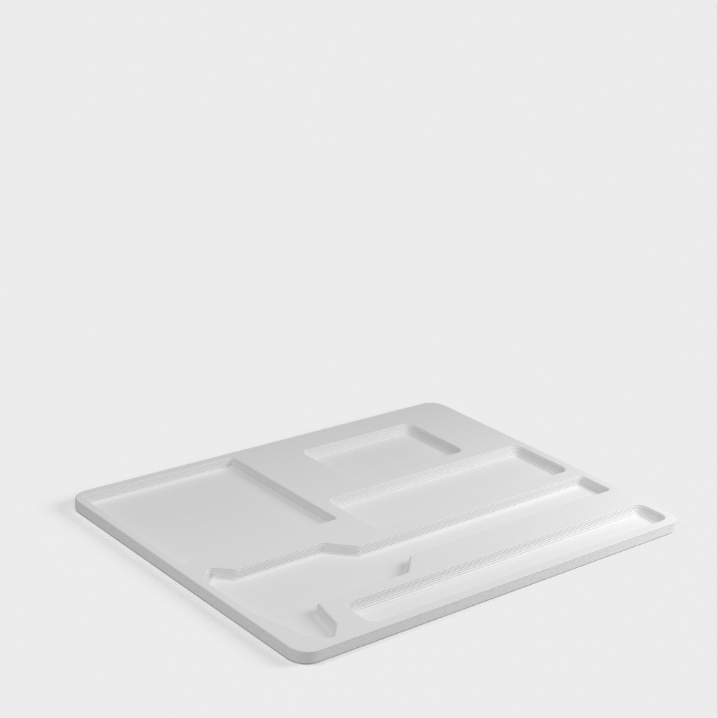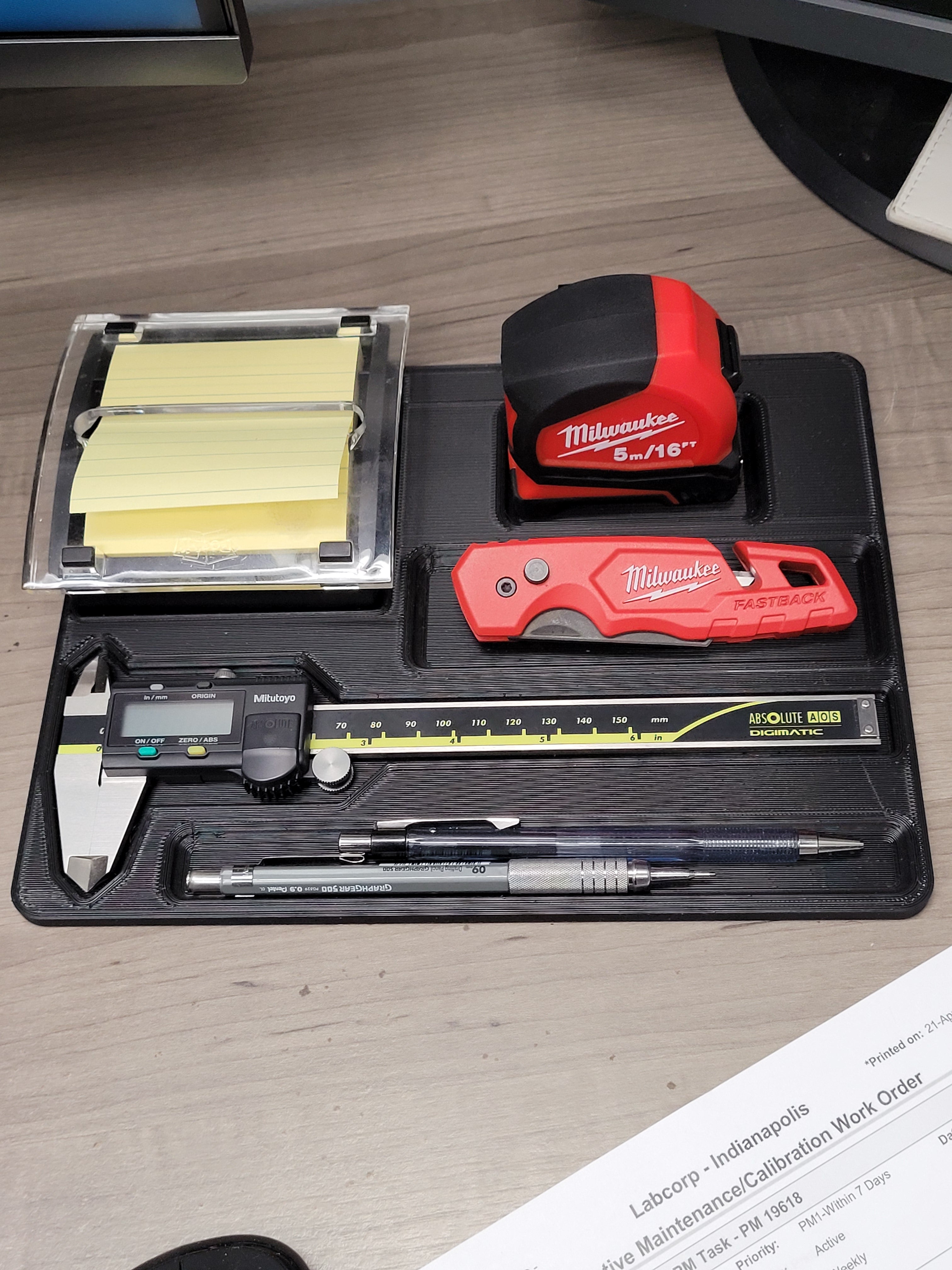 Detta är en stationär sorterare som innehåller olika verktyg och element som är nödvändiga för en organiserad och funktionell arbetsyta. Den innehåller en CD-6" ASX Mitutoyo nockmätare, ett Milwaukee 48-22-6617 måttband, en Milwaukee 48-22-1501 hobbykniv och en Post-it Pop Up-hållare för anteckningar. Det finns också en avsedd plats för pennor, pennor och liknande förnödenheter.