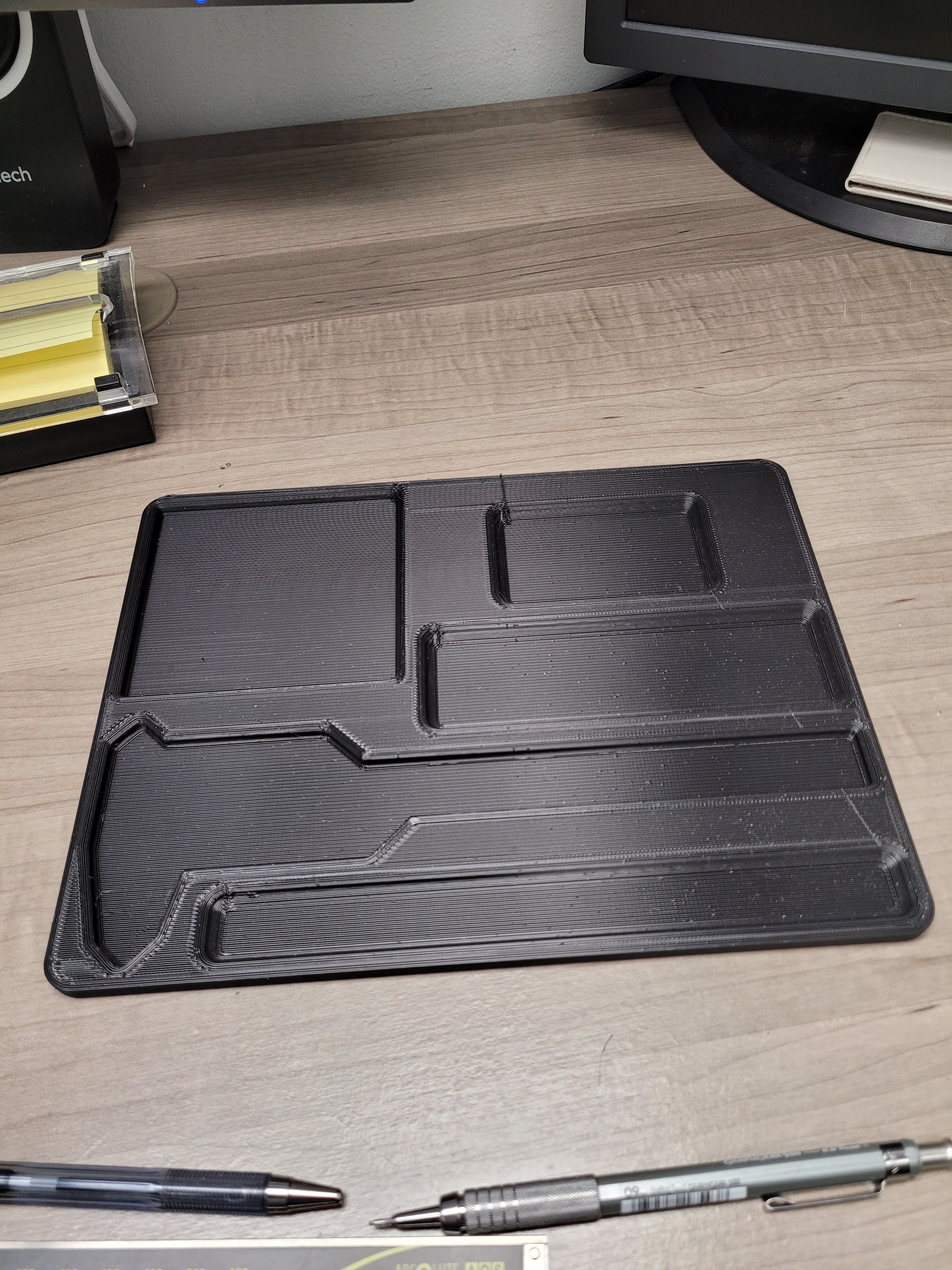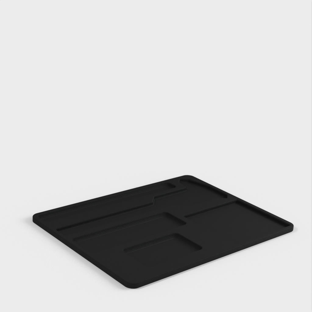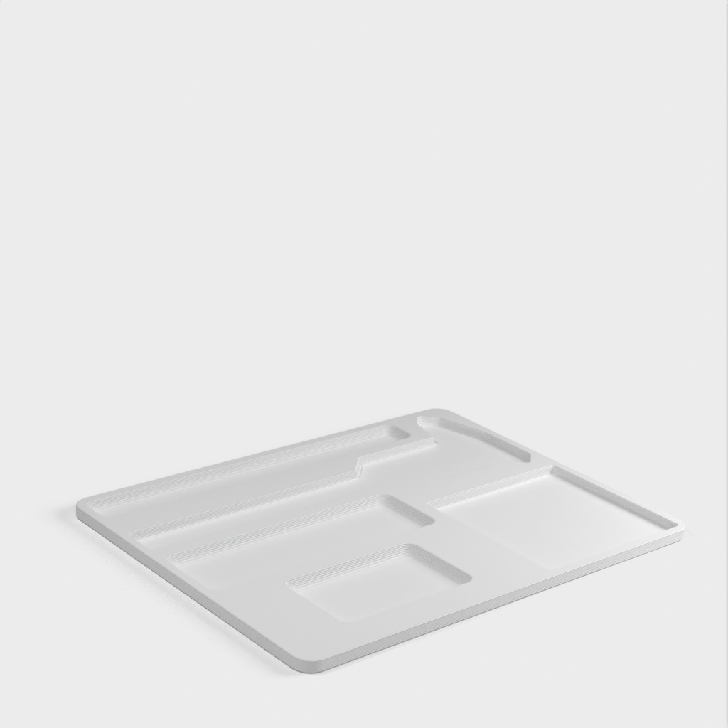Detta är en stationär sorterare som innehåller olika verktyg och element som är nödvändiga för en organiserad och funktionell arbetsyta. Den innehåller en CD-6" ASX Mitutoyo nockmätare, ett Milwaukee 48-22-6617 måttband, en Milwaukee 48-22-1501 hobbykniv och en Post-it Pop Up-hållare för anteckningar. Det finns också en avsedd plats för pennor, pennor och liknande förnödenheter.