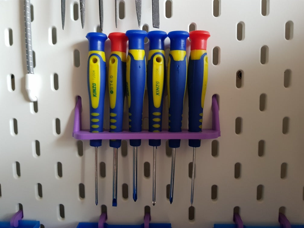 Skruvhållare för IKEA Skadis (SKÅDIS) väggskiva, designad för att hålla 6 mindre skruvmejslar. Hållaren passar perfekt in i din Skadis organisationssystem och gör det enkelt att hålla dina skruvmejslar på plats och inom räckhåll. Väl utformad för att rymma skruvmejslar med handtag som är mindre än metalldelen, denna hållare har ett helt snitt för att skjuta in dem. Den kommer med 7 uttag, även om den bara kan hålla 6 skruvmejslar samtidigt.